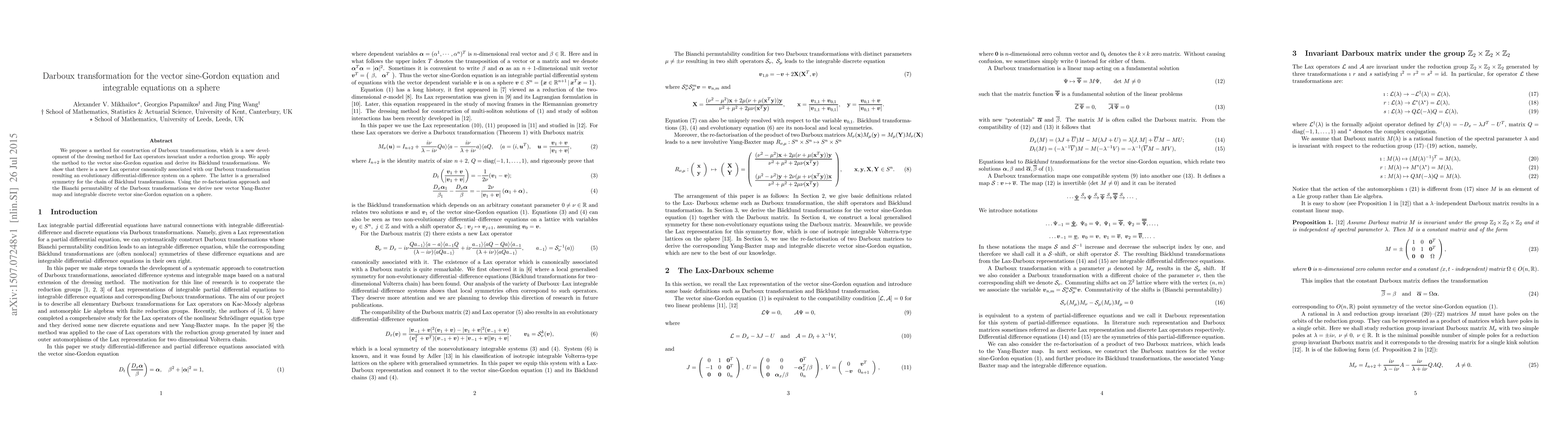 This paper introduces a novel Darboux transformation method for the vector sine-Gordon equation, deriving its Bäcklund transformations and revealing a new Lax operator. It also uncovers an evolutionary differential-difference system on a sphere, leading to a generalised symmetry and new vector Yang-Baxter map, along with an integrable discrete vector sine-Gordon equation on a sphere.