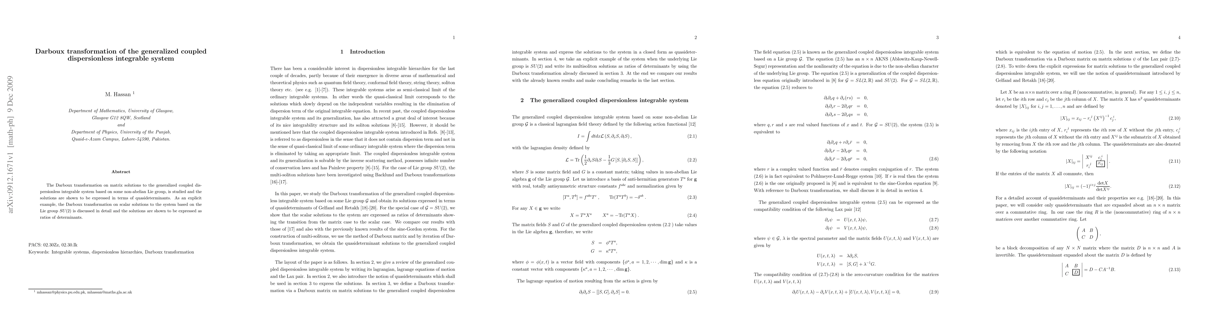 The Darboux transformation on matrix solutions to the generalized coupled dispersionless integrable system based on some non-abelian Lie group, is studied and the solutions are shown to be expressed in terms of quasideterminants. As an explicit example, the Darboux transformation on scalar solutions to the system based on the Lie group SU(2) is discussed in detail and the solutions are shown to be expressed as ratios of determinants.