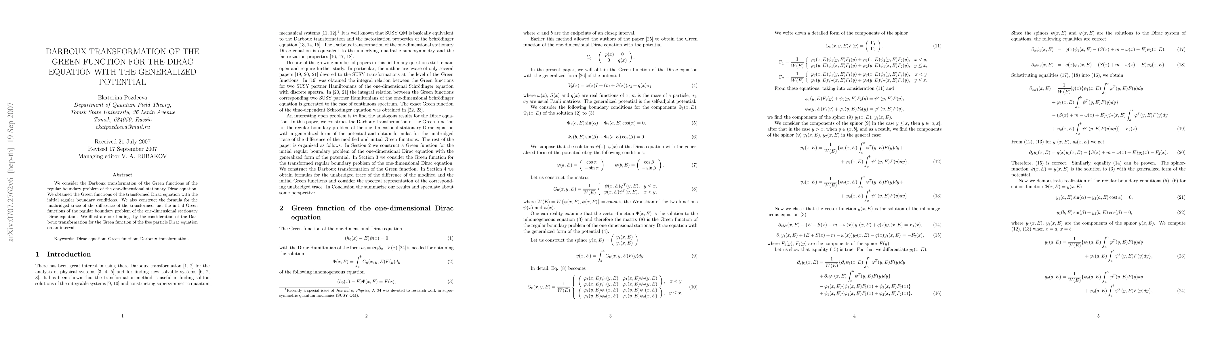 This paper explores the Darboux transformation of the Green functions for the one-dimensional stationary Dirac equation under generalized potentials, deriving transformed Green functions and establishing a formula for their trace difference. It exemplifies the method using the free particle Dirac equation.