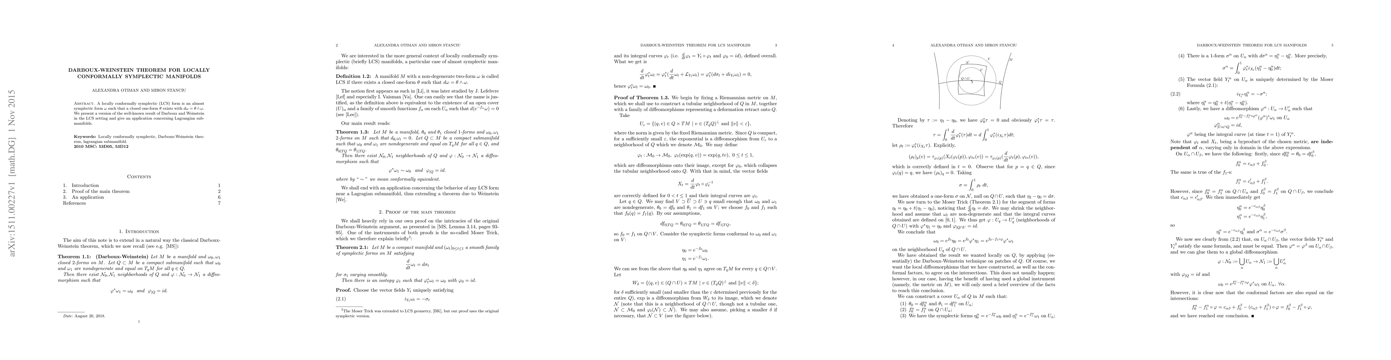 A locally conformally symplectic (LCS) form is an almost symplectic form $\omega$ such that a closed one-form $\theta$ exists with $d\omega = \theta \wedge \omega$. We present a version of the well-known result of Darboux and Weinstein in the LCS setting and give an application concerning Lagrangian submanifolds.