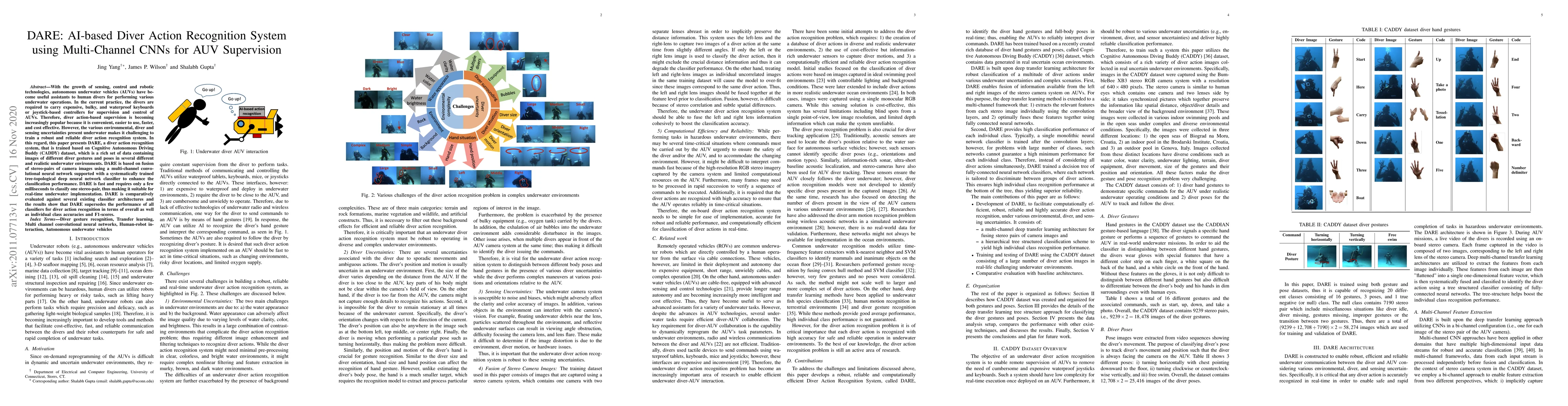 This paper introduces DARE, an AI-based diver action recognition system using multi-channel CNNs for AUV supervision, trained on the CADDY dataset. DARE combines stereo-camera image fusion with a deep neural network classifier, achieving superior performance in real-time diver action recognition compared to existing methods.