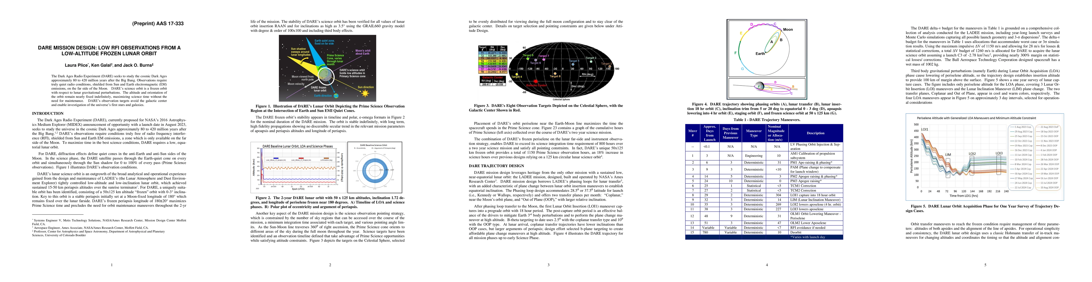 The DARE Mission aims to study the cosmic Dark Ages from a low-altitude frozen lunar orbit, minimizing radio frequency interference to observe the universe's first stars and galaxies. The mission's stable orbit avoids Earth and Sun emissions, providing optimal conditions for the study.