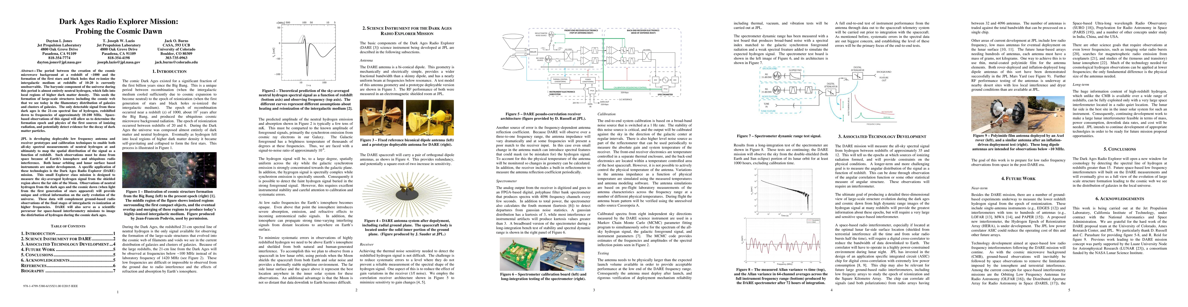 The period between the creation of the cosmic microwave background at a redshift of ~1000 and the formation of the first stars and black holes that re-ionize the intergalactic medium at redshifts of 10-20 is currently unobservable. The baryonic component of the universe during this period is almost entirely neutral hydrogen, which falls into local regions of higher dark matter density. This seeds the formation of large-scale structures including the cosmic web that we see today in the filamentary distribution of galaxies and clusters of galaxies. The only detectable signal from these dark ages is the 21-cm spectral line of hydrogen, redshifted down to frequencies of approximately 10-100 MHz. Space-based observations of this signal will allow us to determine the formation epoch and physics of the first sources of ionizing radiation, and potentially detect evidence for the decay of dark matter particles. JPL is developing deployable low frequency antenna and receiver prototypes to enable both all-sky spectral measurements of neutral hydrogen and ultimately to map the spatial distribution of the signal as a function of redshift. Such observations must be done from space because of Earth's ionosphere and ubiquitous radio interference. A specific application of these technologies is the Dark Ages Radio Explorer (DARE) mission. This small Explorer class mission is designed to measure the sky-averaged hydrogen signal from the shielded region above the far side of the Moon. These data will complement ground-based radio observations of the final stages of intergalactic re-ionization at higher frequencies. DARE will also serve as a scientific percursor for space-based interferometry missions to image the distribution of hydrogen during the cosmic dark ages.