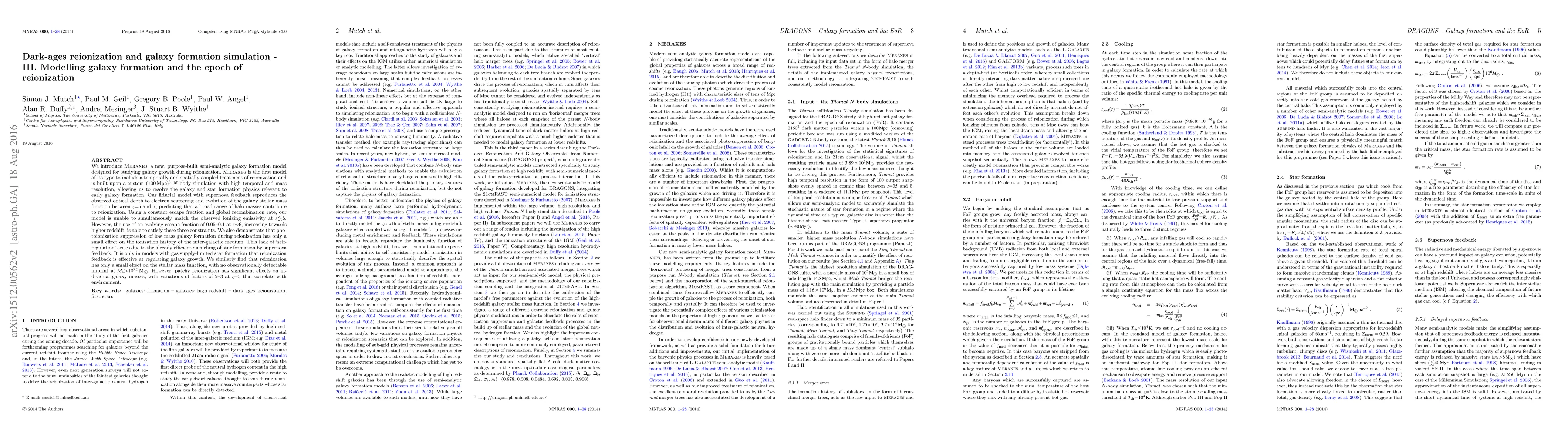 Meraxes, a new semi-analytic galaxy formation model, couples reionization and galaxy formation, resolving early galaxy growth. It successfully matches the observed optical depth and galaxy stellar mass function evolution but requires an evolving escape fraction to align with ionizing emissivity. Reionization's impact on galaxy growth and stellar mass function is minimal, except for patchy reionization effects on individual galaxy masses correlating with their environment.