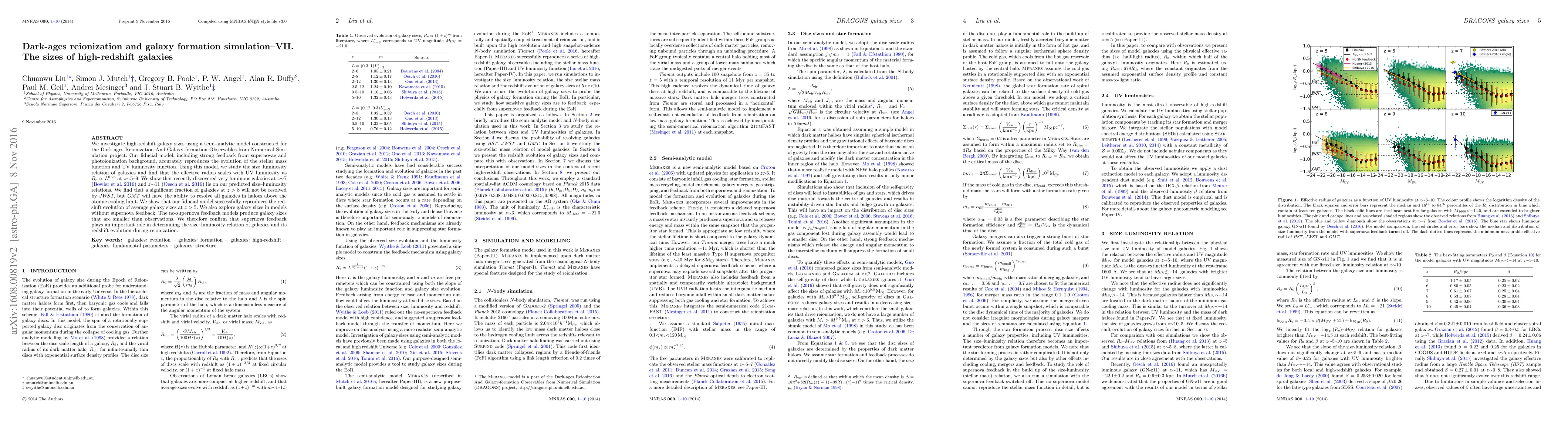 This paper uses a semi-analytic model to study the sizes of high-redshift galaxies, finding that the effective radius scales with UV luminosity as $R_\mathrm{e}\propto L^{0.25}$ at $z{\sim}5$--$9$. The model confirms that supernova feedback is crucial for accurately reproducing observed galaxy sizes and their redshift evolution.