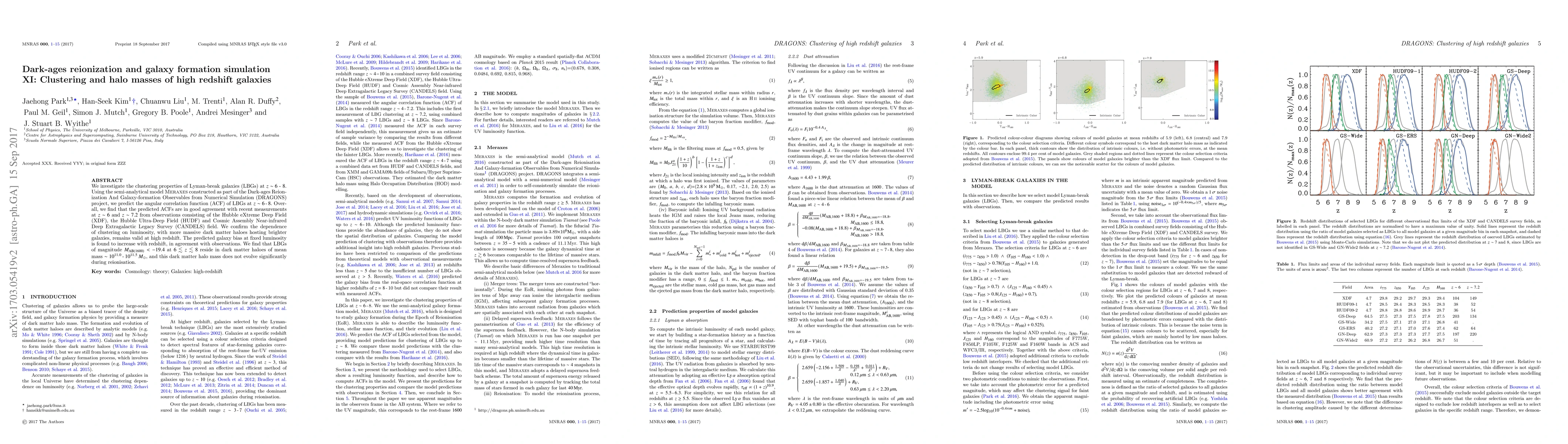 This paper uses the Meraxes semi-analytical model to study the clustering properties of Lyman-break galaxies (LBGs) at high redshifts ($z\sim6$ - $8$), finding good agreement between predicted angular correlation functions and recent observational data. It confirms that brighter galaxies reside in more massive dark matter haloes and that galaxy bias increases with redshift, with LBGs of magnitude $M_{{\rm AB(1600)}} < -19.4$ in $6\lesssim z \lesssim 8$ residing in haloes of mean mass $\sim 10^{11.0}$-$10^{11.5} M_{\rm \odot}$.