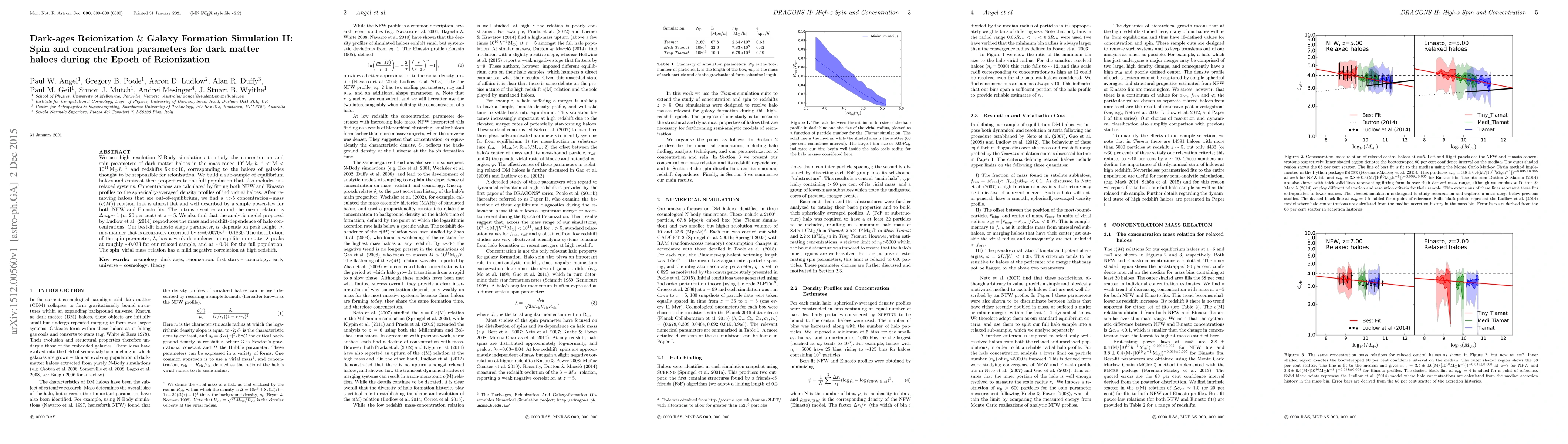 We use high resolution N-Body simulations to study the concentration and spin parameters of dark matter haloes in the mass range $10^8\, {\rm M}_{\odot}\, h^{-1} < {\rm M} < 10^{11}\, {\rm M}_{\odot}\, h^{-1}$ and redshifts $5{<}z{<}10$, corresponding to the haloes of galaxies thought to be responsible for reionization. We build a sub-sample of equilibrium haloes and contrast their properties to the full population that also includes unrelaxed systems. Concentrations are calculated by fitting both NFW and Einasto profiles to the spherically-averaged density profiles of individual haloes. After removing haloes that are out-of-equilibrium, we find a $z{>}5$ concentration$-$mass ($c(M)$) relation that is almost flat and well described by a simple power-law for both NFW and Einasto fits. The intrinsic scatter around the mean relation is $\Delta c_{\rm{vir}}{\sim1}$ (or 20 per cent) at $z=5$. We also find that the analytic model proposed by Ludlow et al. reproduces the mass and redshift-dependence of halo concentrations. Our best-fit Einasto shape parameter, $\alpha$, depends on peak height, $\nu$, in a manner that is accurately described by $\alpha {=}0.0070\nu^2{+}0.1839$. The distribution of the spin parameter, $\lambda$, has a weak dependence on equilibrium state; $\lambda$ peaks at roughly ${\sim}0.033$ for our relaxed sample, and at ${\sim}0.04$ for the full population. The spin--virial mass relation has a mild negative correlation at high redshift.
