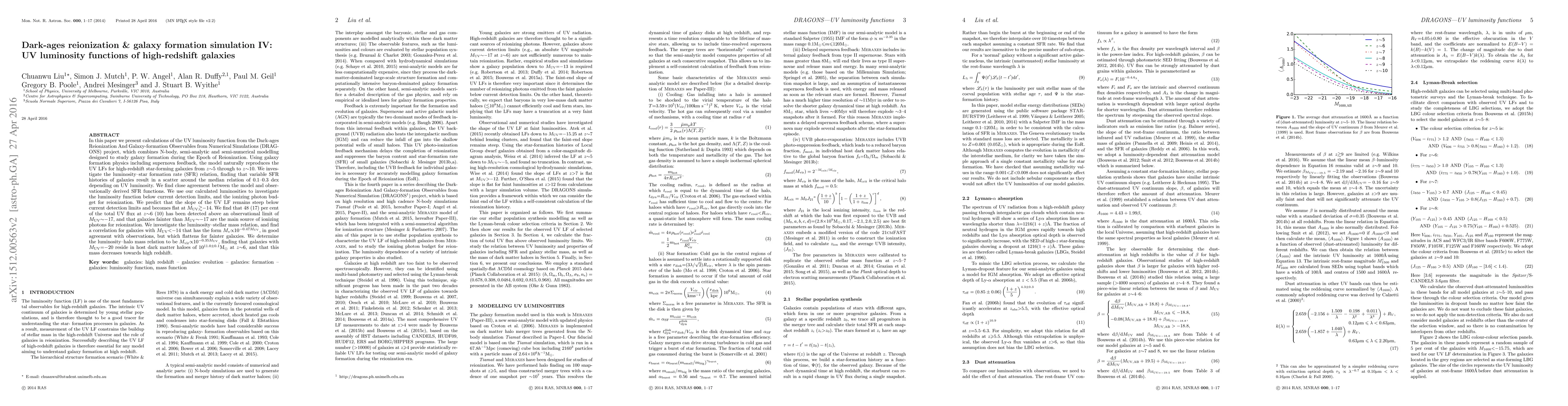 In this paper we present calculations of the UV luminosity function from the Dark-ages Reionization And Galaxy-formation Observables from Numerical Simulations (DRAGONS) project, which combines N-body, semi-analytic and semi-numerical modelling designed to study galaxy formation during the Epoch of Reionization. Using galaxy formation physics including supernova feedback, the model naturally reproduces the UV LFs for high-redshift star-forming galaxies from $z{\sim}5$ through to $z{\sim}10$. We investigate the luminosity--star formation rate (SFR) relation, finding that variable SFR histories of galaxies result in a scatter around the median relation of $0.1$--$0.3$ dex depending on UV luminosity. We find close agreement between the model and observationally derived SFR functions. We use our calculated luminosities to investigate the luminosity function below current detection limits, and the ionizing photon budget for reionization. We predict that the slope of the UV LF remains steep below current detection limits and becomes flat at $M_\mathrm{UV}{\gtrsim}{-14}$. We find that $48$ ($17$) per cent of the total UV flux at $z{\sim}6$ ($10$) has been detected above an observational limit of $M_\mathrm{UV}{\sim}{-17}$, and that galaxies fainter than $M_\mathrm{UV}{\sim}{-17}$ are the main source of ionizing photons for reionization. We investigate the luminosity--stellar mass relation, and find a correlation for galaxies with $M_\mathrm{UV}{<}{-14}$ that has the form $M_*{\propto}10^{-0.47M_\mathrm{UV}}$, in good agreement with observations, but which flattens for fainter galaxies. We determine the luminosity--halo mass relation to be $M_\mathrm{vir}{\propto}10^{-0.35M_\mathrm{UV}}$, finding that galaxies with $M_\mathrm{UV}{=}{-20}$ reside in host dark matter haloes of $10^{11.0\pm 0.1}\mathrm{M_\odot}$ at $z{\sim}6$, and that this mass decreases towards high redshift.