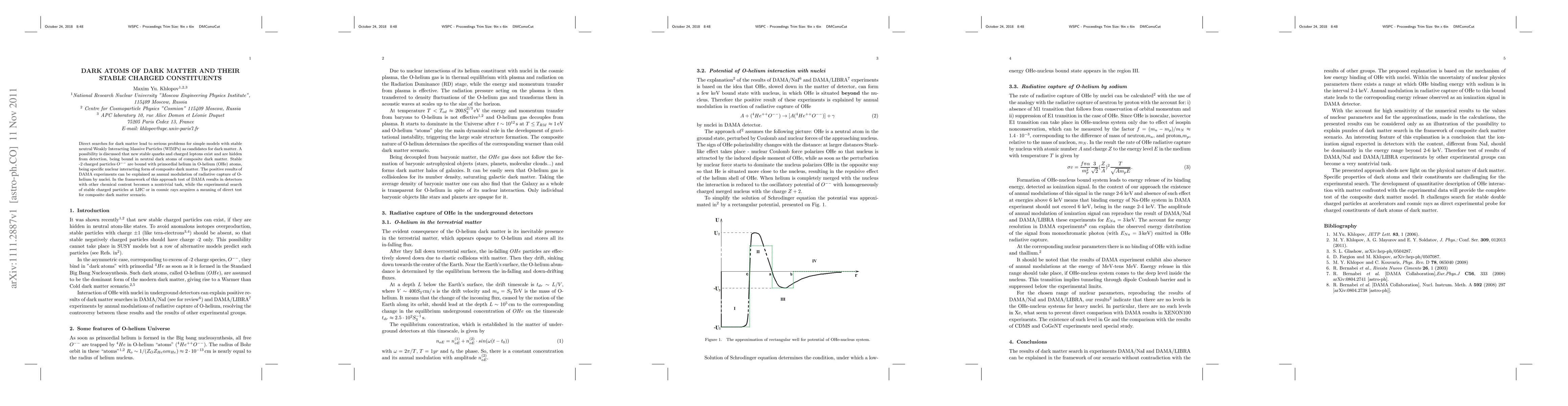 Direct searches for dark matter lead to serious problems for simple models with stable neutral Weakly Interacting Massive Particles (WIMPs) as candidates for dark matter. A possibility is discussed that new stable quarks and charged leptons exist and are hidden from detection, being bound in neutral dark atoms of composite dark matter. Stable -2 charged particles $O^{--}$ are bound with primordial helium in O-helium (OHe) atoms, being specific nuclear interacting form of composite dark matter. The positive results of DAMA experiments can be explained as annual modulation of radiative capture of O-helium by nuclei. In the framework of this approach test of DAMA results in detectors with other chemical content becomes a nontrivial task, while the experimental search of stable charged particles at LHC or in cosmic rays acquires a meaning of direct test for composite dark matter scenario.