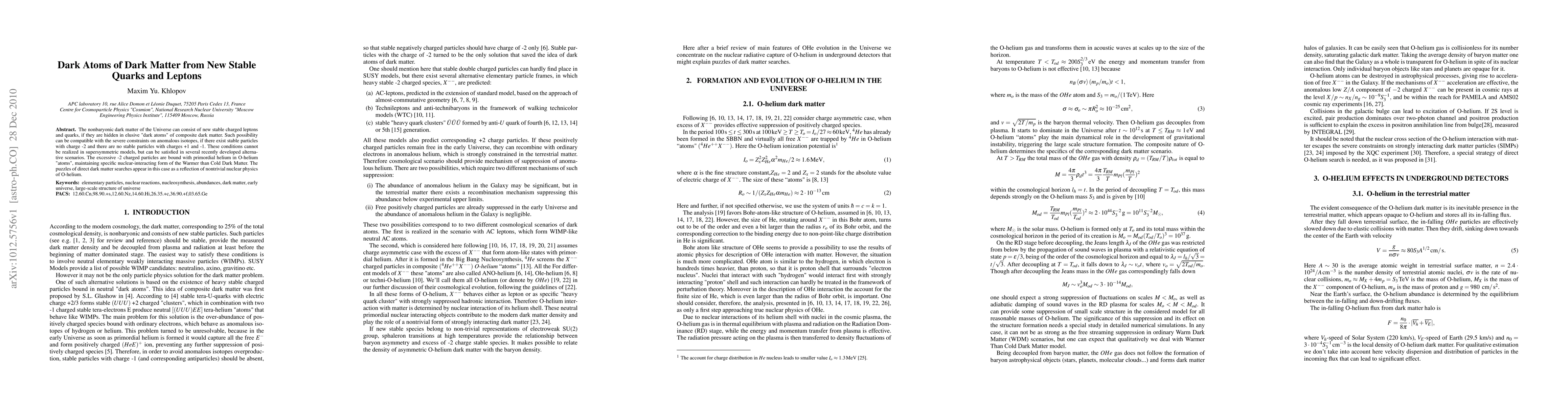 The nonbaryonic dark matter of the Universe can consist of new stable charged leptons and quarks, if they are hidden in elusive "dark atoms" of composite dark matter. Such possibility can be compatible with the severe constraints on anomalous isotopes, if there exist stable particles with charge -2 and there are no stable particles with charges +1 and -1. These conditions cannot be realized in supersymmetric models, but can be satisfied in several recently developed alternative scenarios. The excessive -2 charged particles are bound with primordial helium in O-helium "atoms", maintaining specific nuclear-interacting form of the Warmer than Cold Dark Matter. The puzzles of direct dark matter searches appear in this case as a reflection of nontrivial nuclear physics of O-helium.