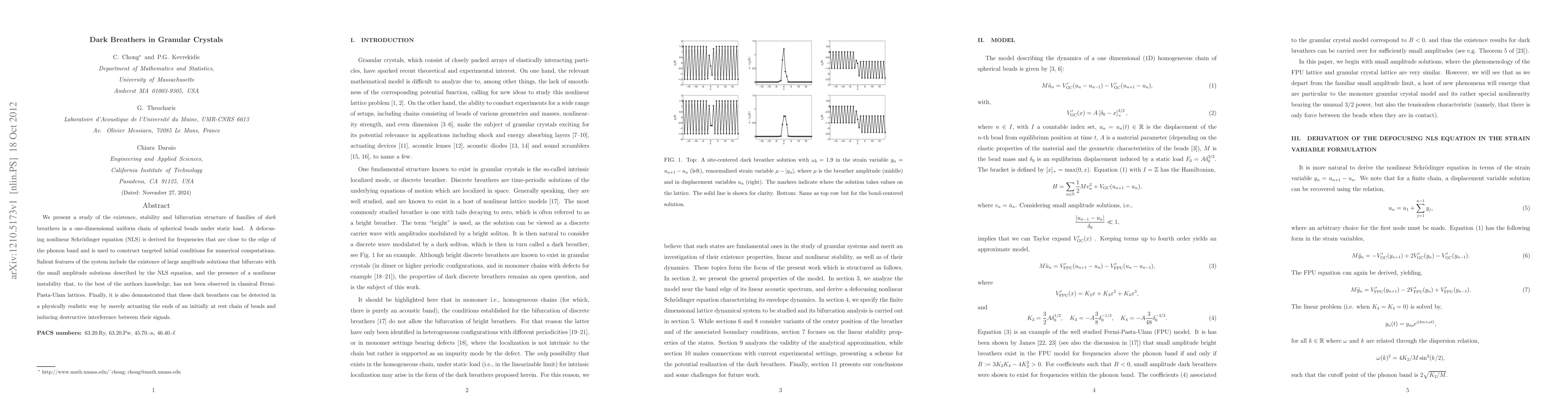 We present a study of the existence, stability and bifurcation structure of families of dark breathers in a one-dimensional uniform chain of spherical beads under static load. A defocus- ing nonlinear Schrodinger equation (NLS) is derived for frequencies that are close to the edge of the phonon band and is used to construct targeted initial conditions for numerical computations. Salient features of the system include the existence of large amplitude solutions that bifurcate with the small amplitude solutions described by the NLS equation, and the presence of a nonlinear instability that, to the best of the authors knowledge, has not been observed in classical Fermi- Pasta-Ulam lattices. Finally, it is also demonstrated that these dark breathers can be detected in a physically realistic way by merely actuating the ends of an initially at rest chain of beads and inducing destructive interference between their signals.