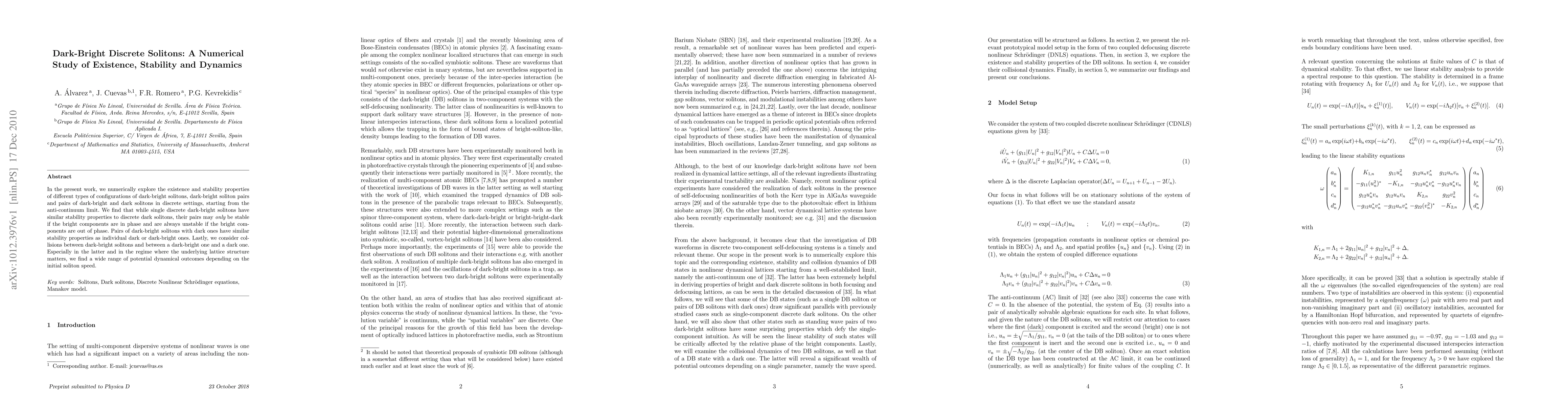 This research numerically investigates the stability and dynamics of dark-bright solitons and their pairs in discrete settings, finding that while single solitons behave similarly to dark solitons, pairs of dark-bright solitons are stable only when their bright components are in phase, while collisions yield varied outcomes based on initial soliton speeds.
