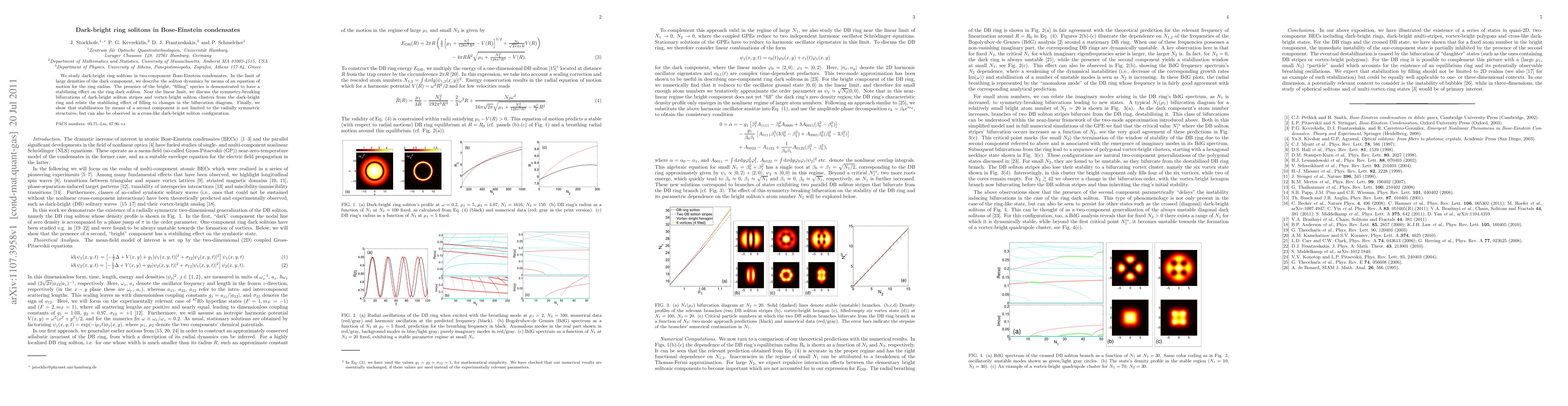 This paper investigates the dynamics and stabilization of dark-bright ring solitons in two-component Bose-Einstein condensates, demonstrating that the presence of a bright component stabilizes the ring soliton and alters bifurcation patterns, with similar stabilization effects observed in cross-like soliton configurations.
