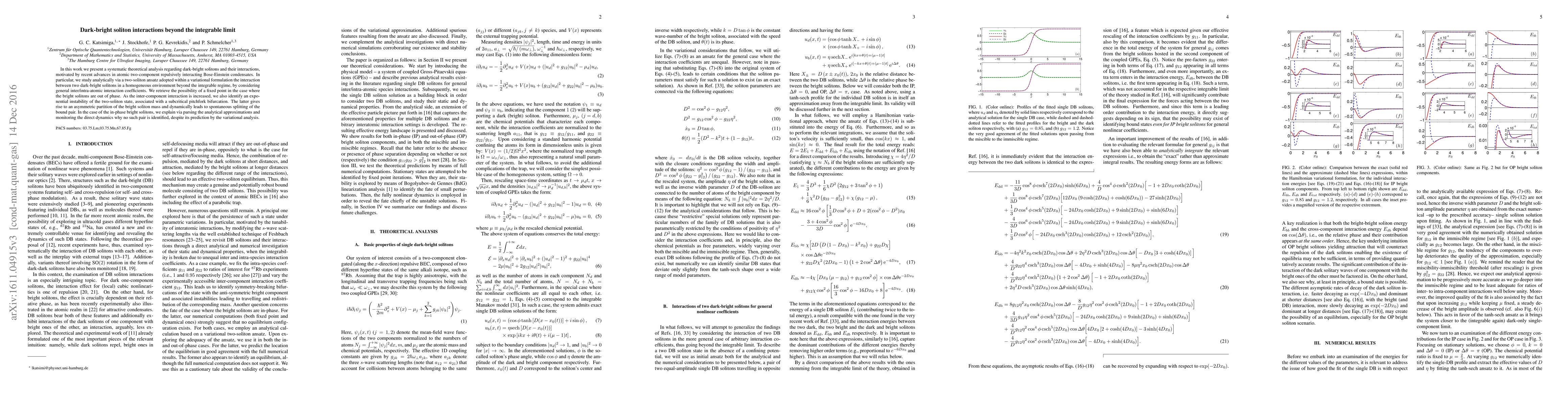 This research analyzes the interaction between dark-bright solitons in non-integrable regimes, finding potential fixed points and exponential instabilities under certain conditions. The study reveals spontaneous splitting of the soliton pair due to asymmetric mass partitioning, with no such pairs identified in the in-phase configuration despite variational predictions.