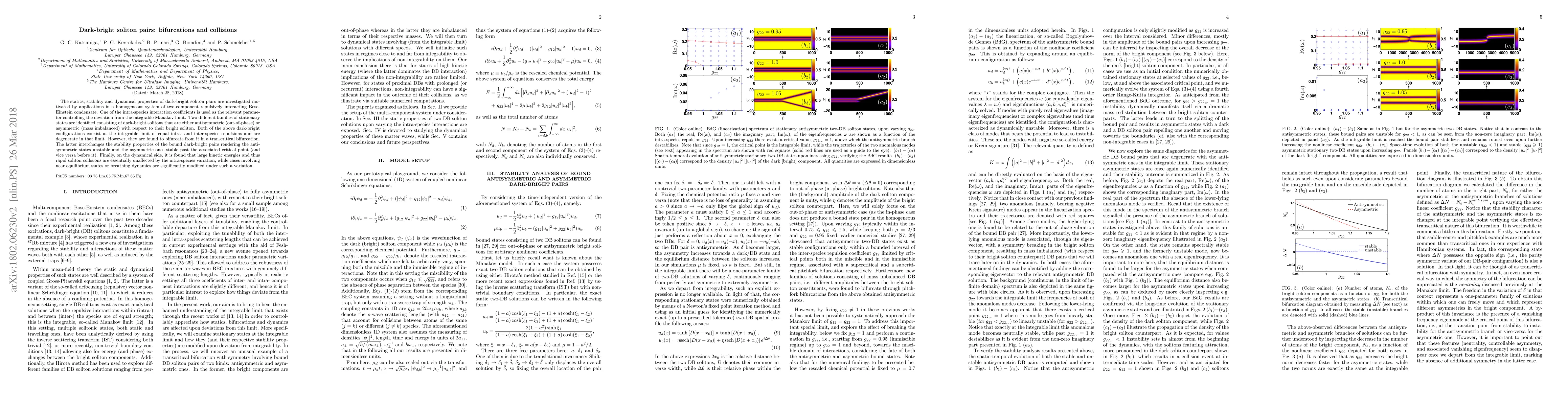 This paper investigates the properties of dark-bright soliton pairs in a two-component Bose-Einstein condensate, identifying two families of stationary states that bifurcate at a critical point, altering their stability. The dynamics of soliton collisions remain largely unaffected by intra-species interactions for high kinetic energies.