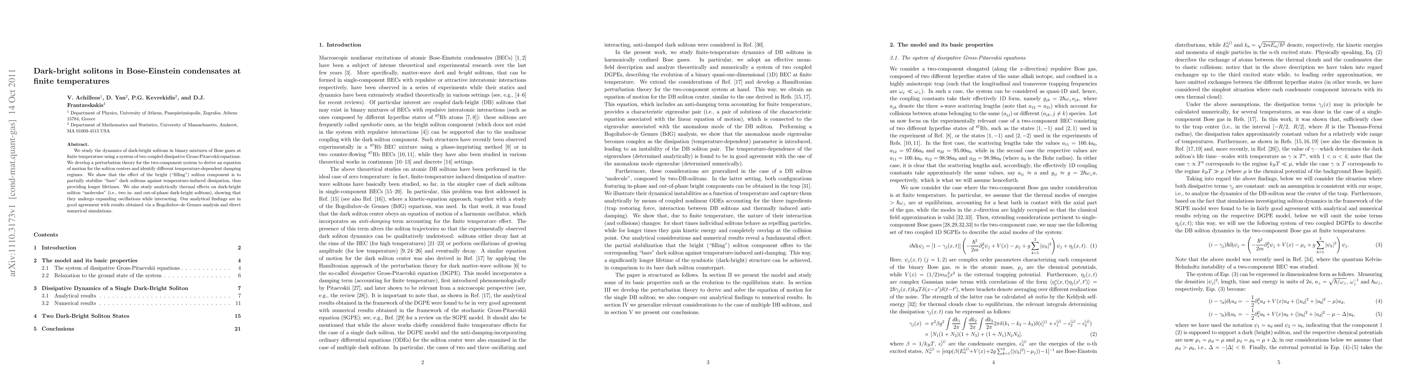 This paper investigates the dynamics of dark-bright solitons in binary Bose-Einstein condensates at finite temperatures, revealing that the bright soliton component partially stabilizes dark solitons against temperature-induced dissipation. Analytical, Bogoliubov-de Gennes analysis, and numerical simulations confirm the solitons' behavior and interactions.