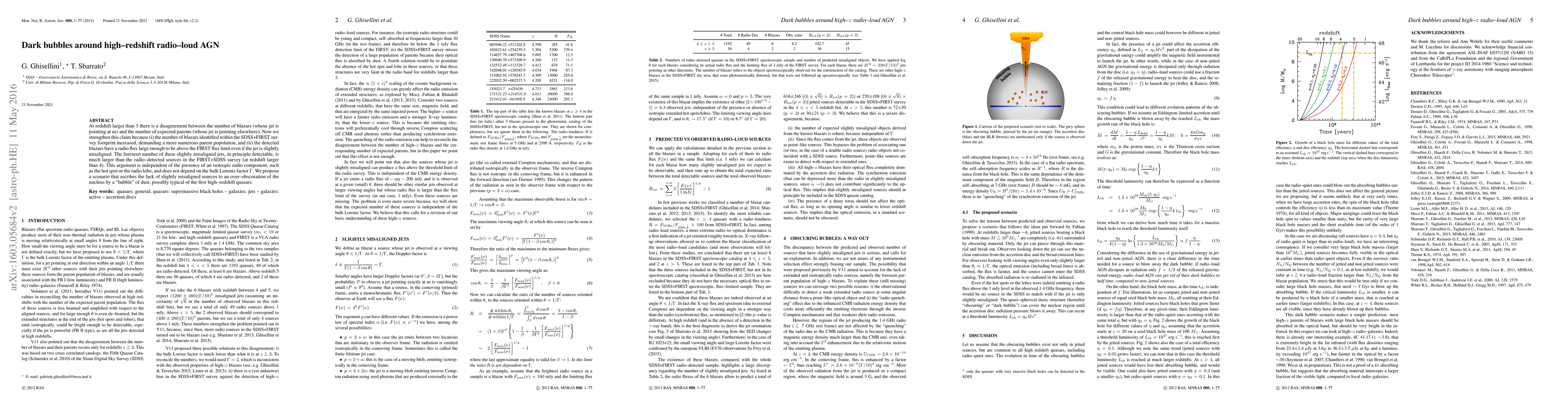 At redshift larger than 3 there is a disagreement between the number of blazars (whose jet is pointing at us) and the number of expected parents (whose jet is pointing elsewhere). Now we strengthen this claim because (i) the number of blazars identified within the SDSS+FIRST survey footprint increased, demanding a more numerous parent population, and (ii) the detected blazars have a radio flux large enough to be above the FIRST flux limit even if the jet is slightly misaligned. The foreseen number of these slightly misaligned jets, in principle detectable, is much larger than the radio-detected sources in the FIRST+SDSS survey (at redshift larger than 4). This argument is independent of the presence of an isotropic radio component, such as the hot spot or the radio lobe, and does not depend on the bulk Lorentz factor Gamma. We propose a scenario that ascribes the lack of slightly misaligned sources to an over-obscuration of the nucleus by a "bubble" of dust, possibly typical of the first high-redshift quasars.