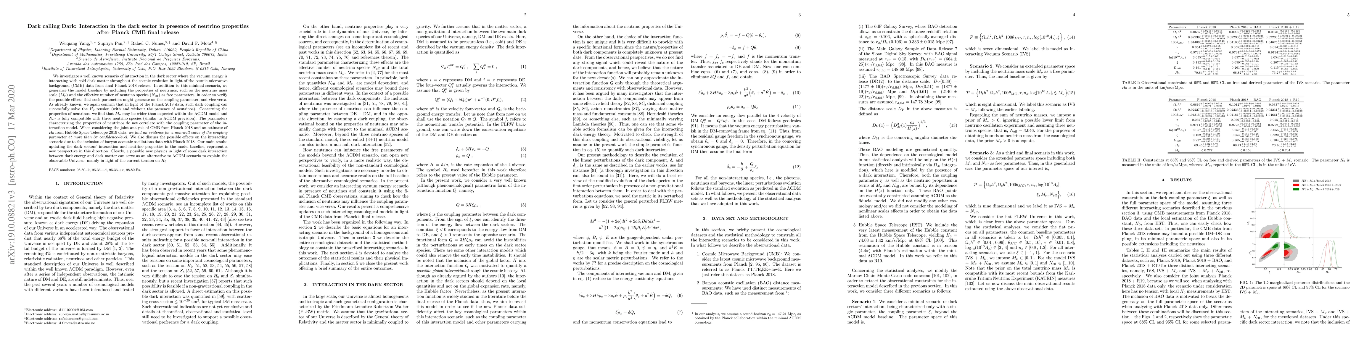 We investigate a well known scenario of interaction in the dark sector where the vacuum energy is interacting with cold dark matter throughout the cosmic evolution in light of the cosmic microwave background (CMB) data from final Planck 2018 release. In addition to this minimal scenario, we generalize the model baseline by including the properties of neutrinos, such as the neutrino mass scale ($M_{\nu}$) and the effective number of neutrino species ($N_{\rm eff}$) as free parameters, in order to verify the possible effects that such parameters might generate on the coupling parameter, and vice versa. As already known, we again confirm that in light of the Planck 2018 data, such dark coupling can successfully solve the $H_0$ tension (with and without the presence of neutrinos). Concerning the properties of neutrinos, we find that $M_{\nu}$ may be wider than expected within the $\Lambda$CDM model and $N_{\rm eff}$ is fully compatible with three neutrino species (similar to $\Lambda$CDM prevision). The parameters characterizing the properties of neutrinos do not correlate with the coupling parameter of the interaction model. When considering the joint analysis of CMB from Planck 2018 and an estimate of $H_0$ from Hubble Space Telescope 2019 data, {\it we find an evidence for a non-null value of the coupling parameter at more than 3$\sigma$ confidence-level.} We also discuss the possible effects on the interacting scenario due to the inclusion of baryon acoustic oscillations data with Planck 2018. Our main results updating the dark sectors' interaction and neutrino properties in the model baseline, represent a new perspective in this direction. Clearly, a possible new physics in light of some dark interaction between dark energy and dark matter can serve as an alternative to $\Lambda$CDM scenario to explain the observable Universe, mainly in light of the current tension on $H_0$.