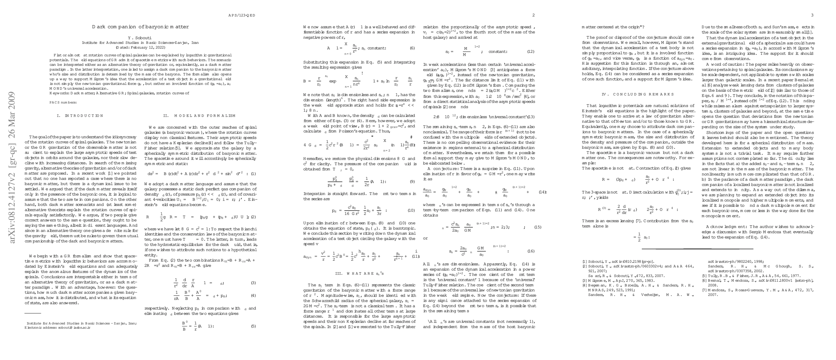 This paper explores the flat rotation curves of spiral galaxies through either alternative gravitational theories or a dark matter paradigm, proposing a dark companion to baryonic matter that influences galactic dynamics, and supports Milgrom's MOND concept of modified gravity.