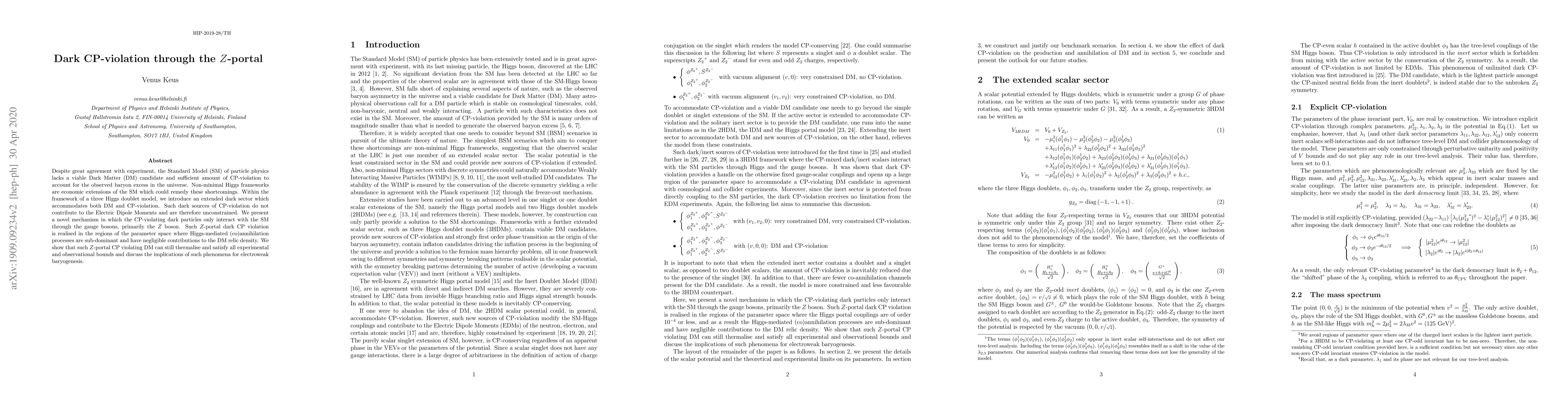 This paper proposes a three Higgs doublet model to address the Standard Model's lack of Dark Matter and CP-violation, introducing a dark sector that allows for CP-violation through the $Z$-portal without affecting Electric Dipole Moments. The $Z$-portal mechanism enables CP-violating dark particles to interact with the Standard Model, potentially impacting electroweak baryogenesis while satisfying all experimental constraints.
