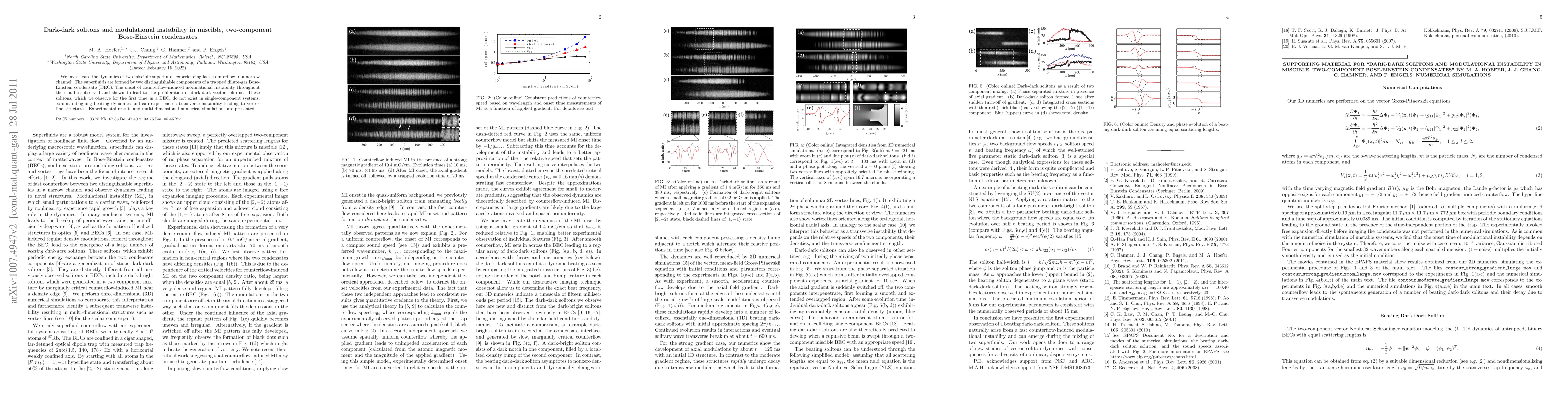 This research investigates the dynamics of miscible superfluids in a Bose-Einstein condensate under fast counterflow, revealing modulational instability that generates unique dark-dark vector solitons with complex beating dynamics and potential transverse instabilities. Experimental observations and simulations support these findings.