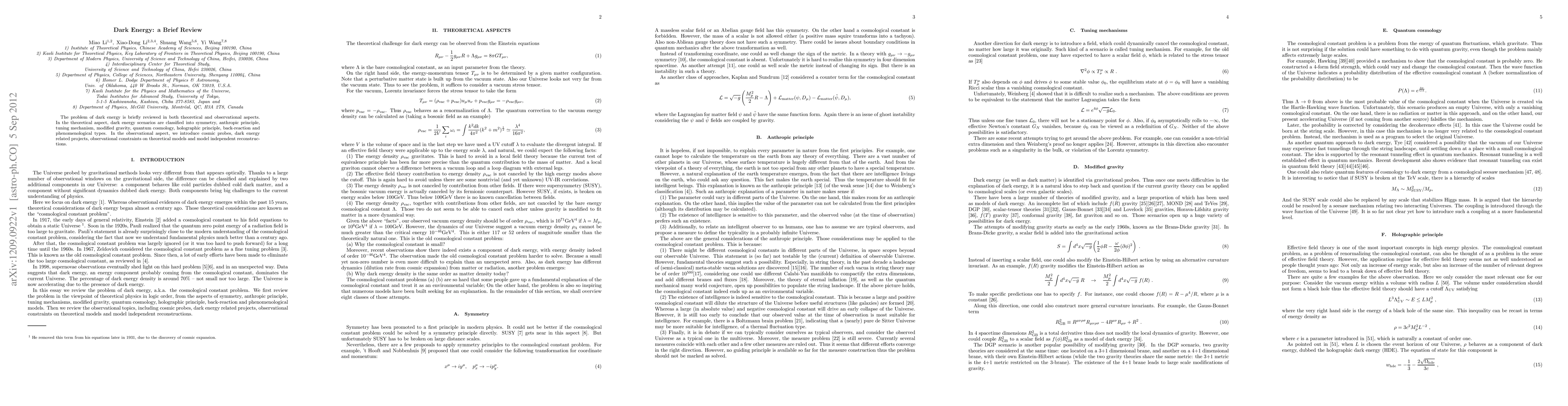 The problem of dark energy is briefly reviewed in both theoretical and observational aspects. In the theoretical aspect, dark energy scenarios are classified into symmetry, anthropic principle, tuning mechanism, modified gravity, quantum cosmology, holographic principle, back-reaction and phenomenological types. In the observational aspect, we introduce cosmic probes, dark energy related projects, observational constraints on theoretical models and model independent reconstructions.