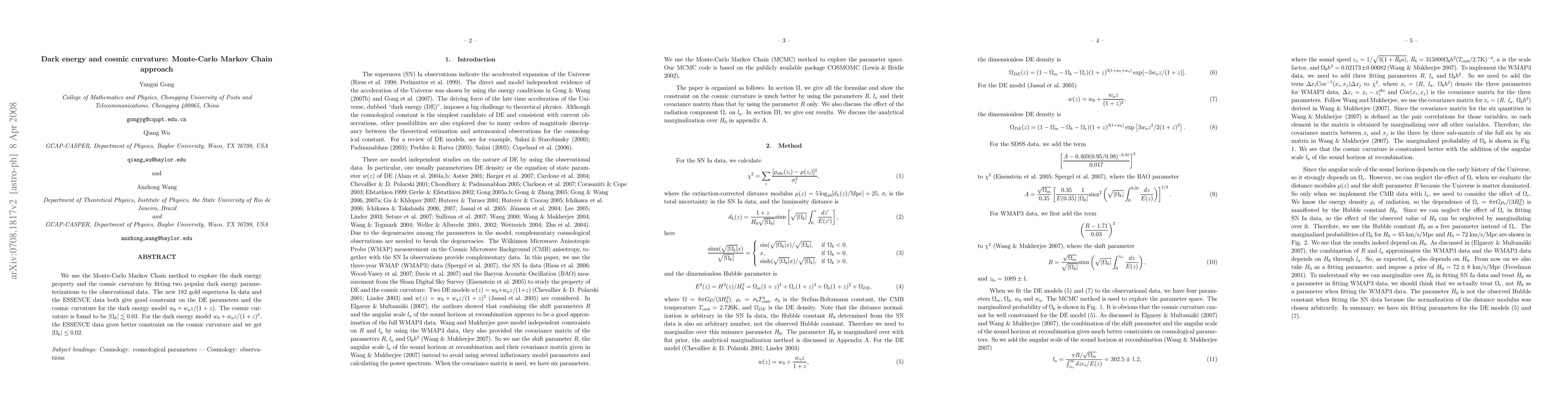 This paper employs the Monte-Carlo Markov Chain method to analyze dark energy properties and cosmic curvature using observational data from supernova Ia and ESSENCE. It finds that the cosmic curvature is constrained to be $|\Omega_k|\la 0.03$ for the $w_0+w_a z/(1+z)$ model and $|\Omega_k|\leq 0.02$ for the $w_0+w_a z/(1+z)^2$ model.