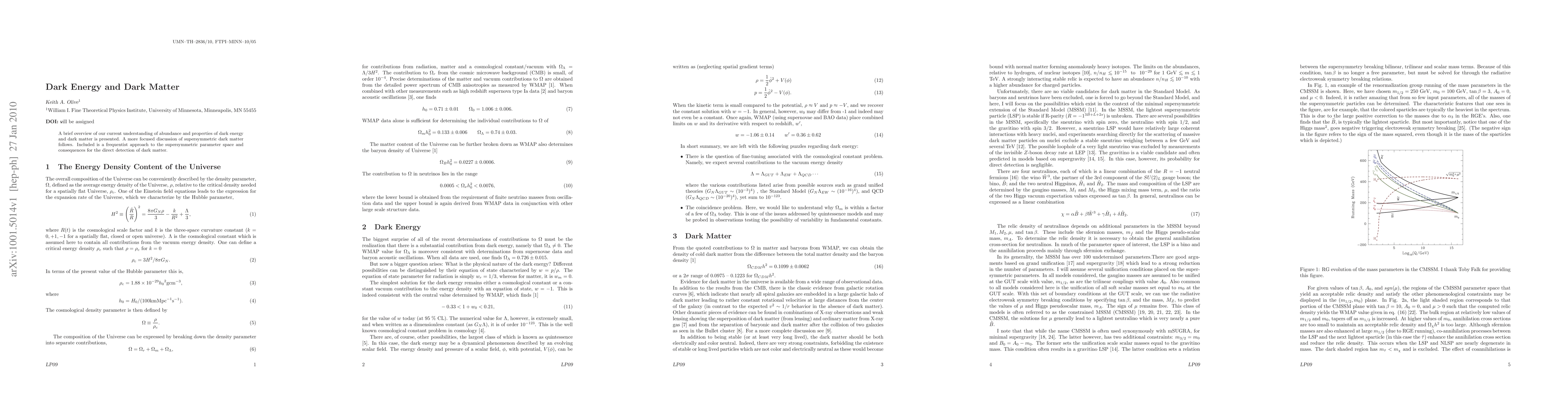 A brief overview of our current understanding of abundance and properties of dark energy and dark matter is presented. A more focused discussion of supersymmetric dark matter follows. Included is a frequentist approach to the supersymmetric parameter space and consequences for the direct detection of dark matter.
