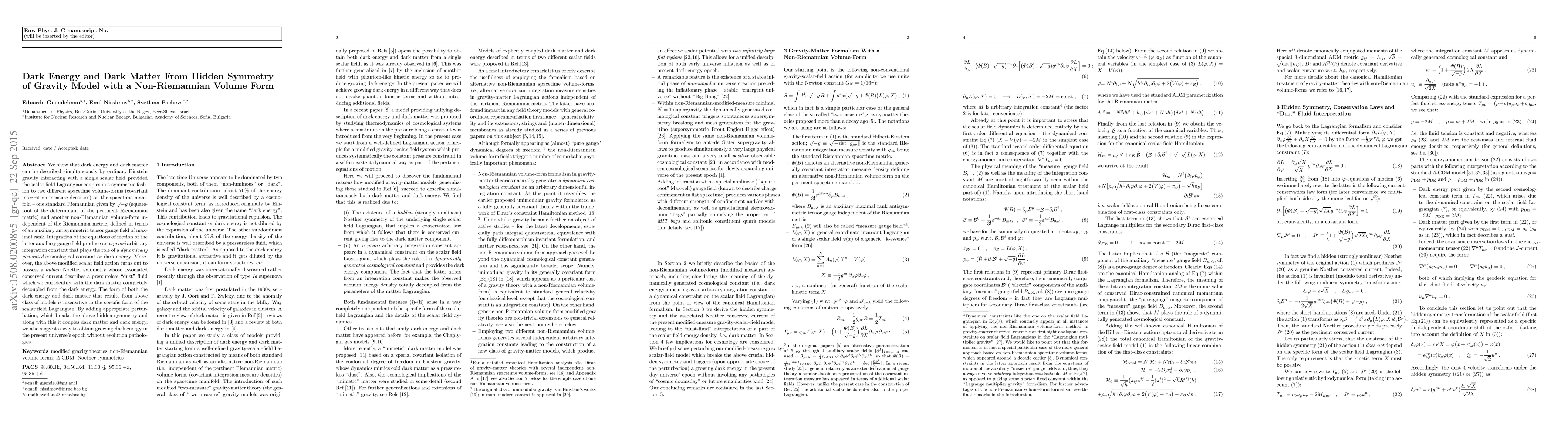 We show that dark energy and dark matter can be described simultaneously by ordinary Einstein gravity interacting with a single scalar field provided the scalar field Lagrangian couples in a symmetric fashion to two different spacetime volume-forms (covariant integration measure densities) on the spacetime manifold - one standard Riemannian given by the square-root of the determinant of the pertinent Riemannian metric and another non-Riemannian volume-form independent of the Riemannian metric, defined in terms of an auxiliary antisymmetric tensor gauge field of maximal rank. Integration of the equations of motion of the latter auxiliary gauge field produce an a priori arbitrary integration constant that plays the role of a dynamically generated cosmological constant or dark energy. Moreover, the above modified scalar field action turns out to possess a hidden Noether symmetry whose associated conserved current describes a pressureless "dust" fluid which we can identify with the dark matter completely decoupled from the dark energy. The form of both the dark energy and dark matter that results from above class of models is insensitive to the specific form of the scalar field Lagrangian. By adding appropriate perturbation, which breaks the above hidden symmetry and along with this it couples dark matter and dark energy, we also suggest a way to obtain growing dark energy in the present universe's epoch without evolution pathologies.