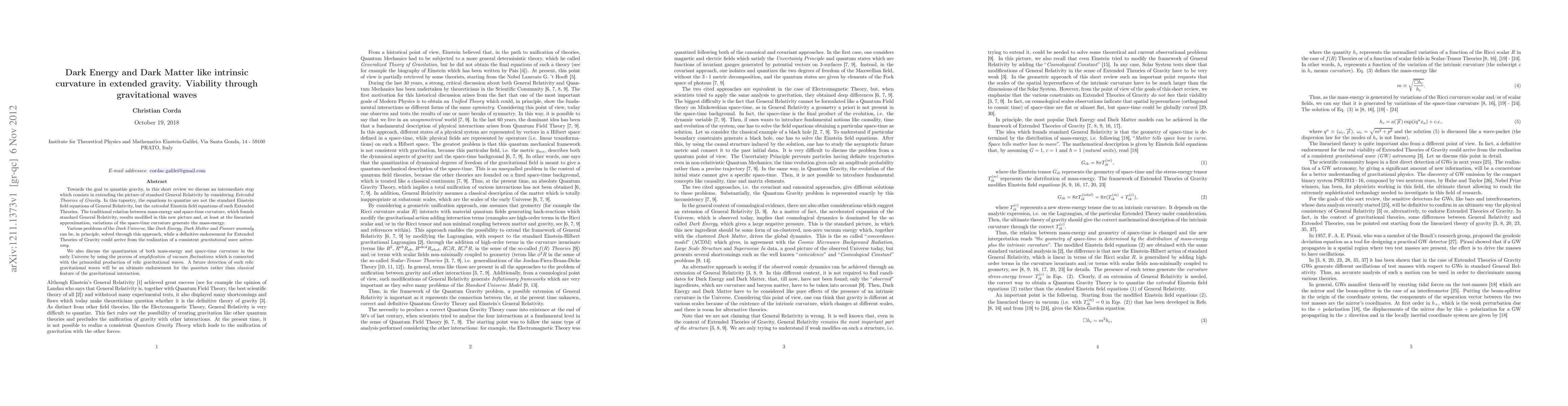 Towards the goal to quantize gravity, in this short review we discuss an intermediate step which consists in extending the picture of standard General Relativity by considering Extended Theories of Gravity. In this tapestry, the equations to quantize are not the standard Einstein field equations of General Relativity, but the extended Einstein field equations of such Extended Theories. The traditional relation between mass-energy and space-time curvature, which founds standard General Relativity, results modified in this new picture and, at least at the linearized approximation, variations of the space-time curvature generate the mass-energy. Various problems of the Dark Universe, Dark Energy, Dark Matter and Pioneer anomaly, can be, in principle, solved through this approach, while a definitive endorsement for Extended Theories of Gravity could arrive from the realization of a consistent gravitational wave astronomy. We also discuss the quantization of both mass-energy and space-time curvature in the early Universe by using the process of amplification of vacuum fluctuations which is connected with the primordial production of relic gravitational waves. A future detection of such relic gravitational waves will be an ultimate endorsement for the quantum rather than classical feature of the gravitational interaction.