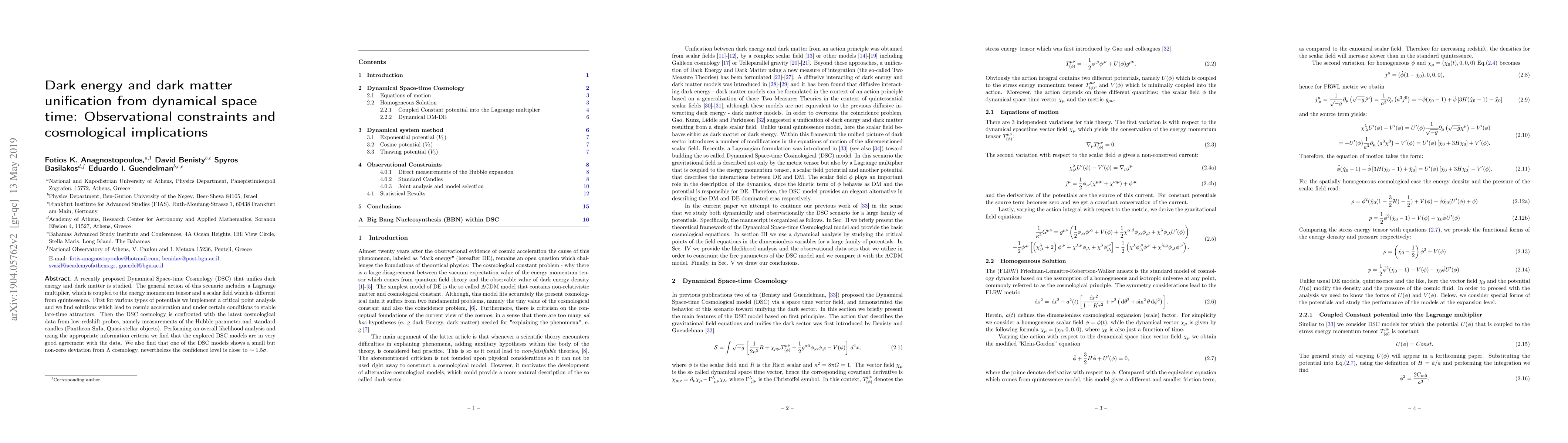 This paper explores a Dynamical Space-time Cosmology (DSC) model that unifies dark energy and dark matter, finding solutions that lead to cosmic acceleration and stable late-time attractors. The DSC model is consistent with recent cosmological data, showing a slight deviation from $\Lambda$ cosmology at nearly 1.5$\sigma$ confidence level.