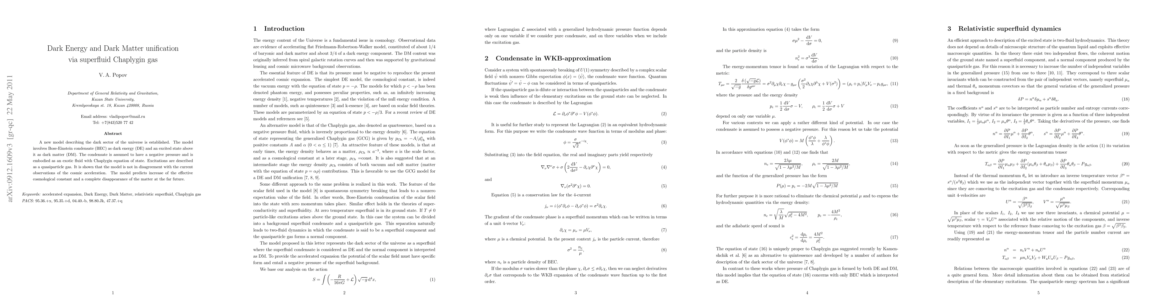 A new model describing the dark sector of the universe is established. The model involves Bose-Einstein condensate (BEC) as dark energy (DE) and an excited state above it as dark matter (DM). The condensate is assumed to have a negative pressure and is embodied as an exotic fluid with Chaplygin equation of state. Excitations are described as a quasiparticle gas. It is shown that the model is not in disagreement with the current observations of the cosmic acceleration. The model predicts increase of the effective cosmological constant and a complete disappearance of the matter at the far future.