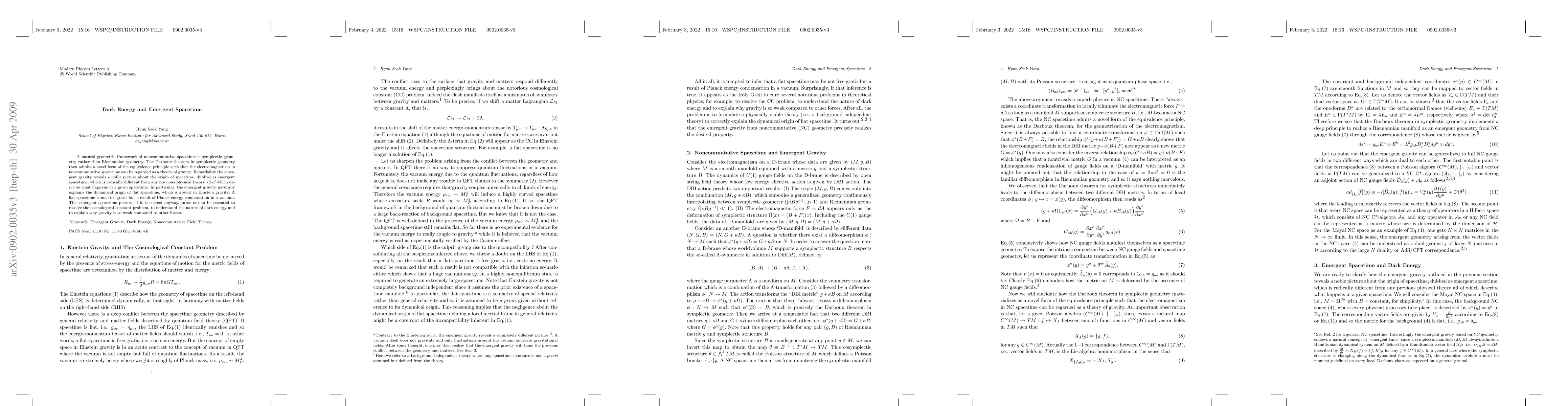 This paper proposes a novel framework of noncommutative spacetime based on symplectic geometry, suggesting that electromagnetism can be seen as a theory of gravity. It introduces the concept of emergent spacetime, which explains the origin of flat spacetime as a result of Planck energy condensation and resolves the cosmological constant problem, offering insights into dark energy and the weakness of gravity.