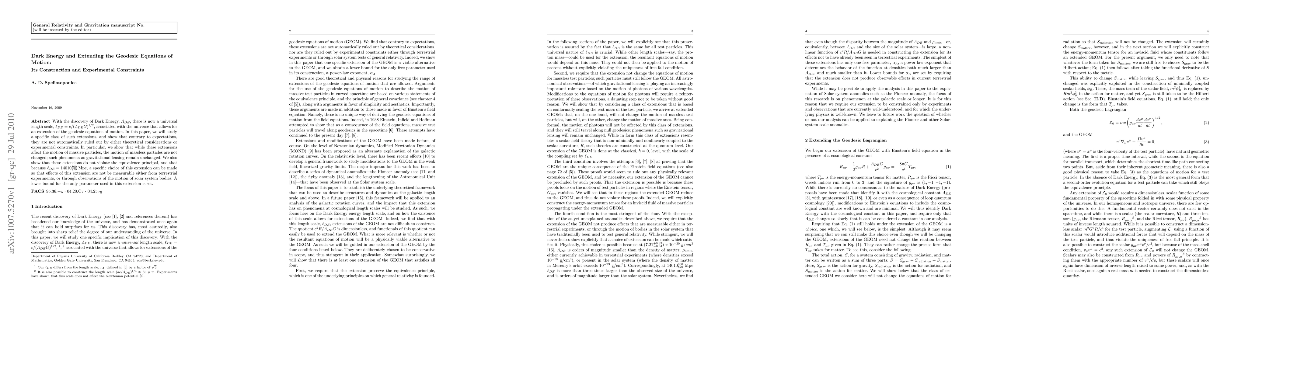With the discovery of Dark Energy, $\Lambda_{DE}$, there is now a universal length scale, $\ell_{DE}=c/(\Lambda_{DE} G)^{1/2}$, associated with the universe that allows for an extension of the geodesic equations of motion. In this paper, we will study a specific class of such extensions, and show that contrary to expectations, they are not automatically ruled out by either theoretical considerations or experimental constraints. In particular, we show that while these extensions affect the motion of massive particles, the motion of massless particles are not changed; such phenomena as gravitational lensing remain unchanged. We also show that these extensions do not violate the equivalence principal, and that because $\ell_{DE}=14010^{800}_{820}$ Mpc, a specific choice of this extension can be made so that effects of this extension are not be measurable either from terrestrial experiments, or through observations of the motion of solar system bodies. A lower bound for the only parameter used in this extension is set.