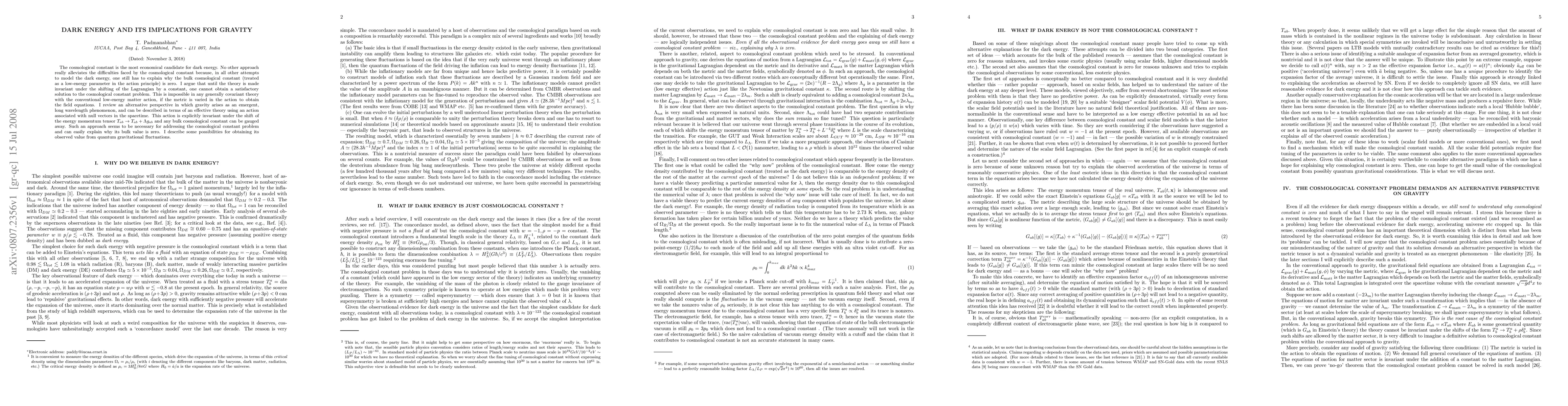 The cosmological constant is the most economical candidate for dark energy. No other approach really alleviates the difficulties faced by the cosmological constant because, in all other attempts to model the dark energy, one still has to explain why the bulk cosmological constant (treated as a low-energy parameter in the action principle) is zero. I argue that until the theory is made invariant under the shifting of the Lagrangian by a constant, one cannot obtain a satisfactory solution to the cosmological constant problem. This is impossible in any generally covariant theory with the conventional low-energy matter action, if the metric is varied in the action to obtain the field equations. I review an alternative perspective in which gravity arises as an emergent, long wavelength phenomenon and can be described in terms of an effective theory using an action associated with null vectors in the spacetime. This action is explicitly invariant under the shift of the energy momentum tensor $T_{ab}\to T_{ab}+\Lambda g_{ab}$ and any bulk cosmological constant can be gauged away. Such an approach seems to be necessary for addressing the cosmological constant problem and can easily explain why its bulk value is zero. I describe some possibilities for obtaining its observed value from quantum gravitational fluctuations.