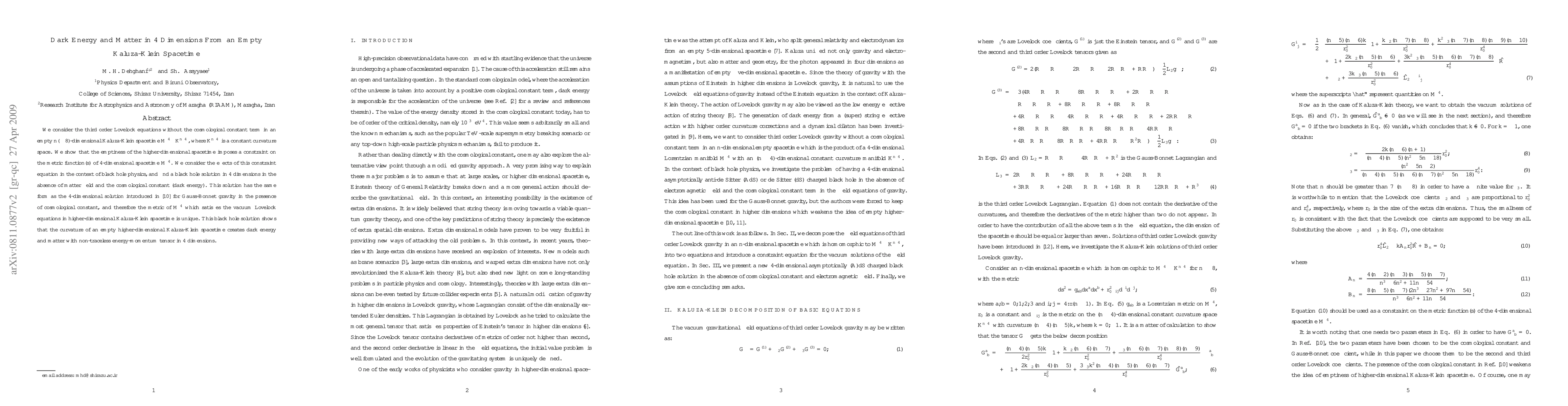 This paper explores third-order Lovelock equations in an empty higher-dimensional Kaluza-Klein spacetime, demonstrating that the higher-dimensional emptiness constrains the 4-dimensional spacetime metric. The study reveals a unique black hole solution in 4 dimensions without matter or cosmological constant, indicating that higher-dimensional curvature can generate dark energy and matter in 4 dimensions.