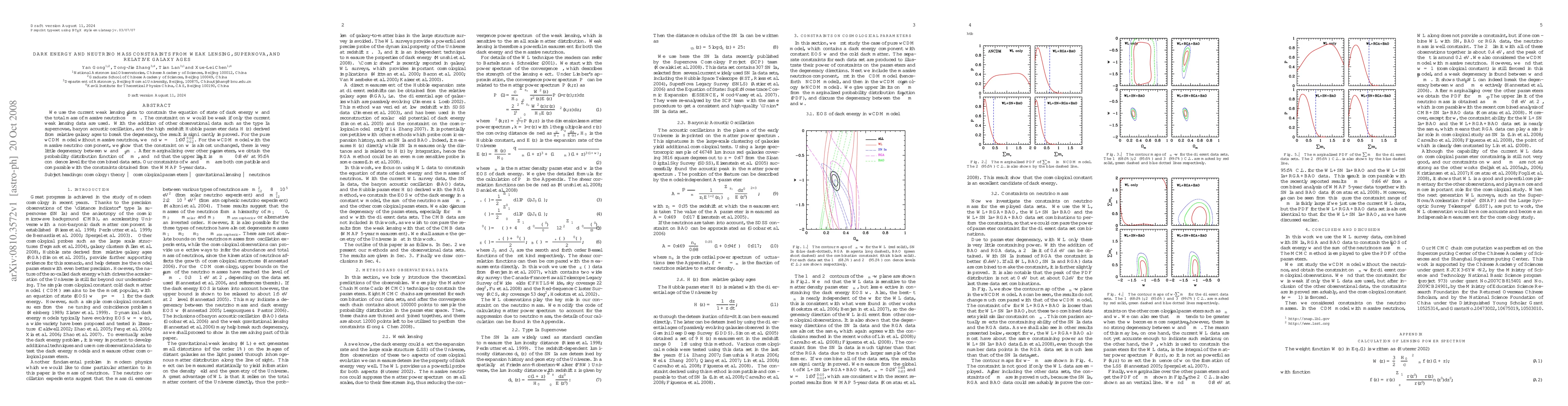 This paper combines weak lensing, supernova, baryon acoustic oscillation, and high redshift Hubble parameter data to constrain dark energy's equation of state $w$ and total neutrino mass $\sum m_{\nu}$. The results show $w=-1.00^{+0.10}_{-0.12}$ and an upper limit of $\sum m_{\nu} \leq 0.8$ eV at 95.5% confidence, indicating minimal degeneracy between $w$ and $\sum m_{\nu}$.