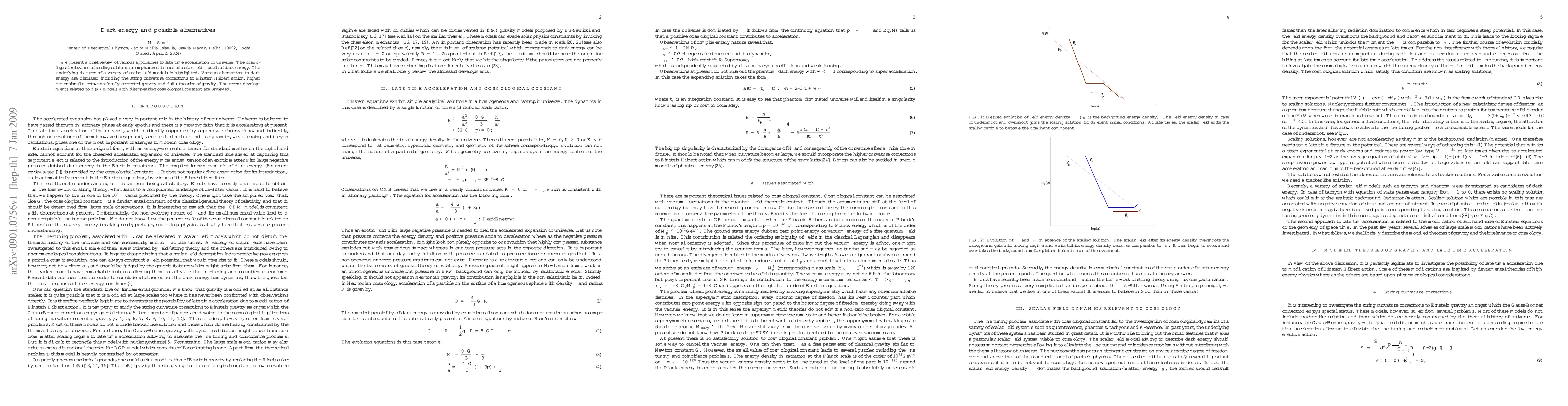 This paper reviews late-time acceleration of the universe, focusing on scalar field models of dark energy and exploring alternatives like string curvature corrections, higher-dimensional effects, and $f(R)$ gravity theories, with a special emphasis on recent developments in $f(R)$ models.