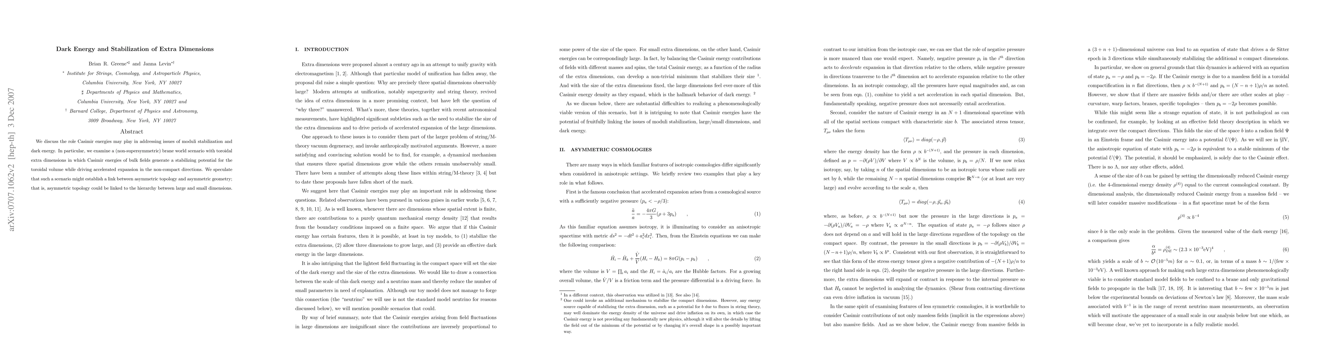 This paper explores how Casimir energies in a non-supersymmetric brane world scenario with toroidal extra dimensions can stabilize moduli and contribute to dark energy, driving accelerated expansion and potentially linking asymmetric topology to geometric dimension hierarchies.
