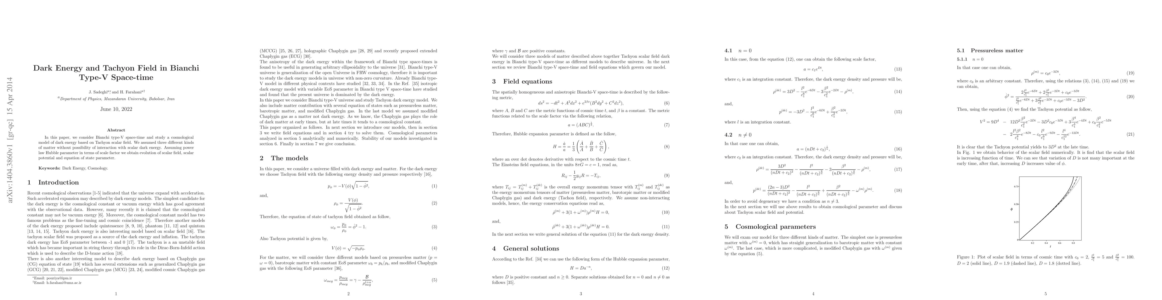 This paper investigates a cosmological model of dark energy based on a Tachyon scalar field in Bianchi Type-V space-time, without interaction between the two, and finds evolution equations for the scalar field and equation of state parameter.