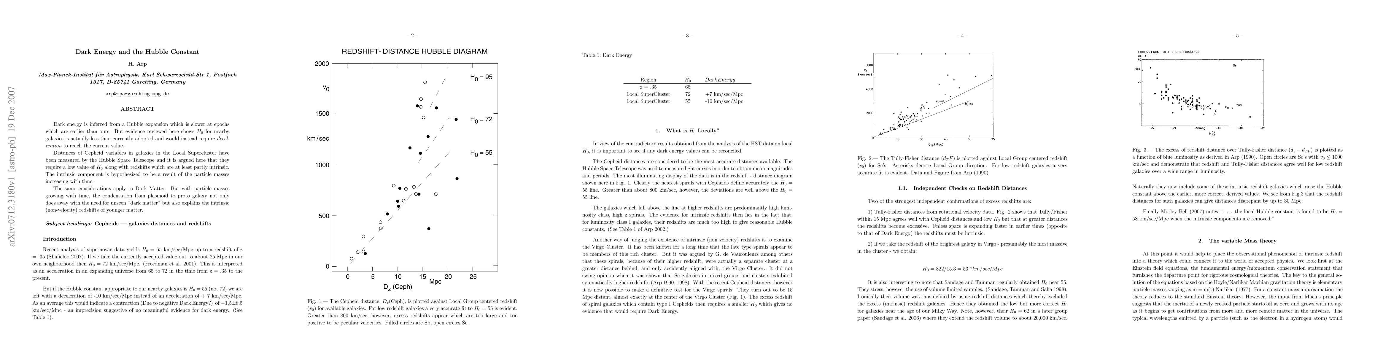 Dark energy is inferred from a Hubble expansion which is slower at epochs which are earlier than ours. But evidence reviewed here shows $H_0$ for nearby galaxies is actually less than currently adopted and would instead require {\it deceleration} to reach the current value. Distances of Cepheid variables in galaxies in the Local Supercluster have been measured by the Hubble Space Telescope and it is argued here that they require a low value of $H_0$ along with redshifts which are at least partly intrinsic. The intrinsic component is hypothesized to be a result of the particle masses increasing with time. The same considerations apply to Dark Matter. But with particle masses growing with time, the condensation from plasmoid to proto galaxy not only does away with the need for unseen ``dark matter'' but also explains the intrinsic (non-velocity) redshifts of younger matter.
