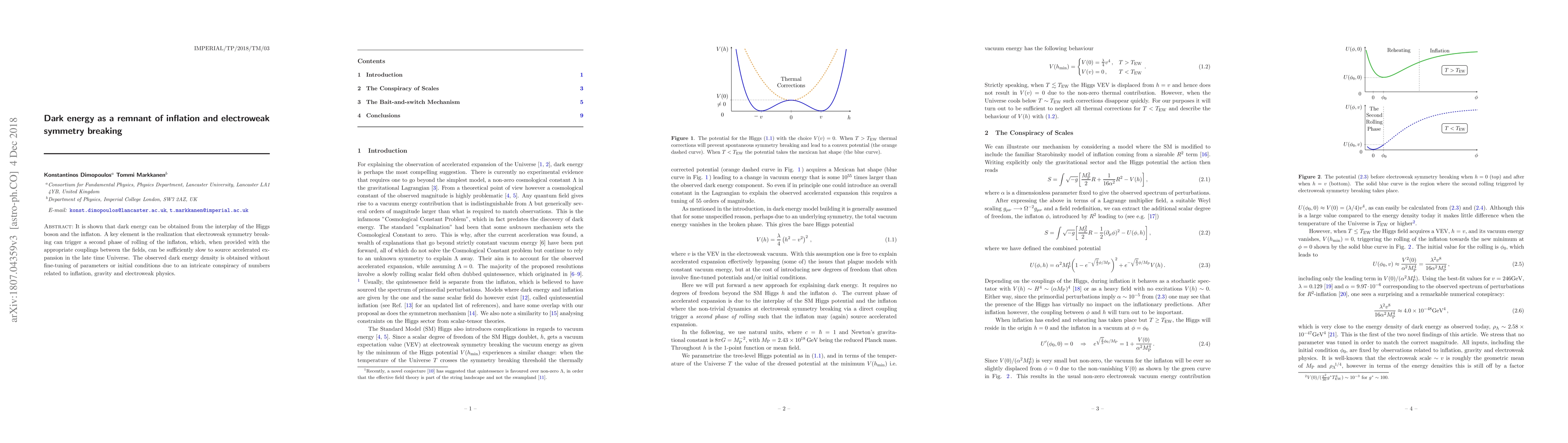 It is shown that dark energy can be obtained from the interplay of the Higgs boson and the inflaton. A key element is the realization that electroweak symmetry breaking can trigger a second phase of rolling of the inflaton, which, when provided with the appropriate couplings between the fields, can be sufficiently slow to source accelerated expansion in the late time Universe. The observed dark energy density is obtained without fine-tuning of parameters or initial conditions due to an intricate conspiracy of numbers related to inflation, gravity and electroweak physics.