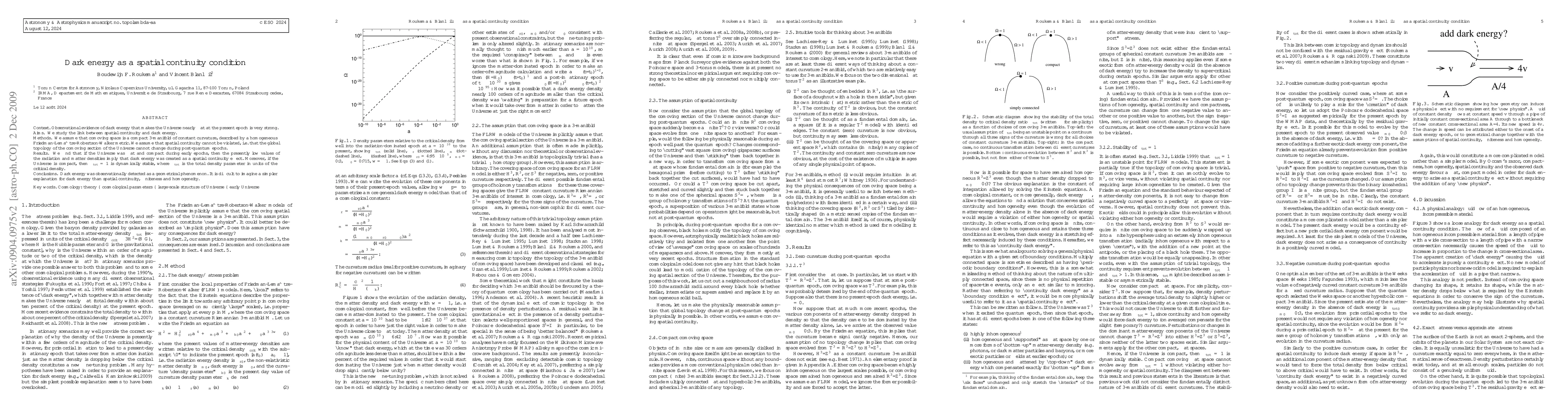 Observational evidence of dark energy that makes the Universe nearly flat at the present epoch is very strong. We study the link between spatial continuity and dark energy. We assume that comoving space is a compact 3-manifold of constant curvature, described by a homogeneous Friedman-Lemaitre-Robertson-Walker metric. We assume that spatial continuity cannot be violated, i.e. that the global topology of the comoving section of the Universe cannot change during post-quantum epochs. We find that if the Universe was flat and compact during early epochs, then the presently low values of the radiation and matter densities imply that dark energy was created as a spatial continuity effect. Moreover, if the Universe is compact, then Omega_tot=1 is dynamically stable, where Omega_tot is the total density parameter in units of the critical density. Dark energy was observationally detected as a geometrical phenomenon. It is difficult to imagine a simpler explanation for dark energy than spatial continuity, finiteness and homogeneity.