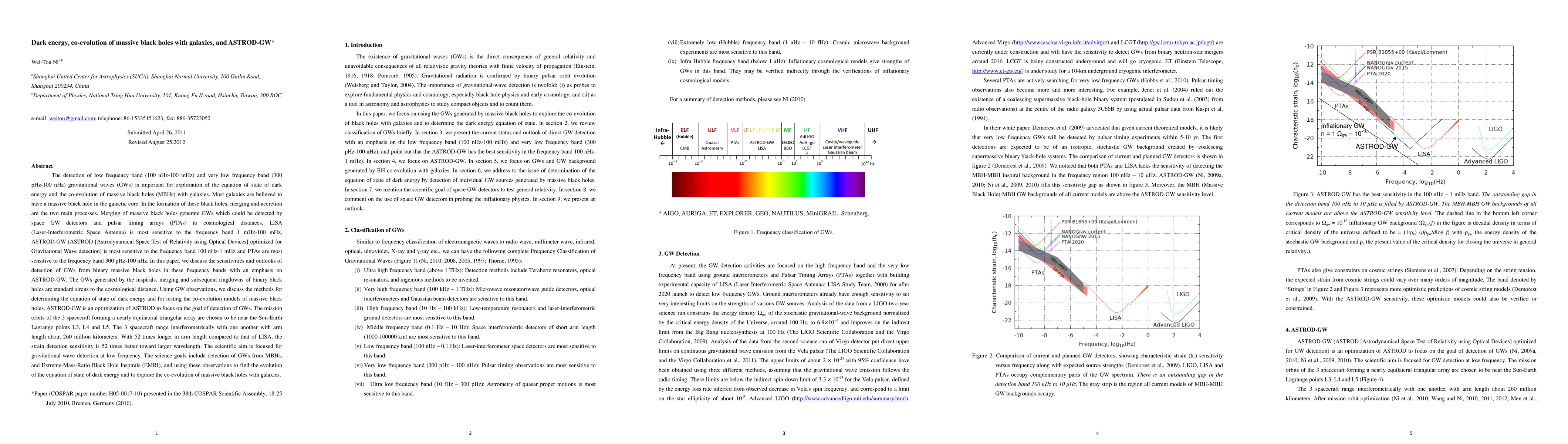 This paper explores the potential of low and very low frequency gravitational wave (GW) detections in understanding dark energy's equation of state and the co-evolution of massive black holes with galaxies. ASTROD-GW, optimized for GW detection, aims to detect GWs from binary black holes, aiding in the determination of dark energy and testing black hole co-evolution models.