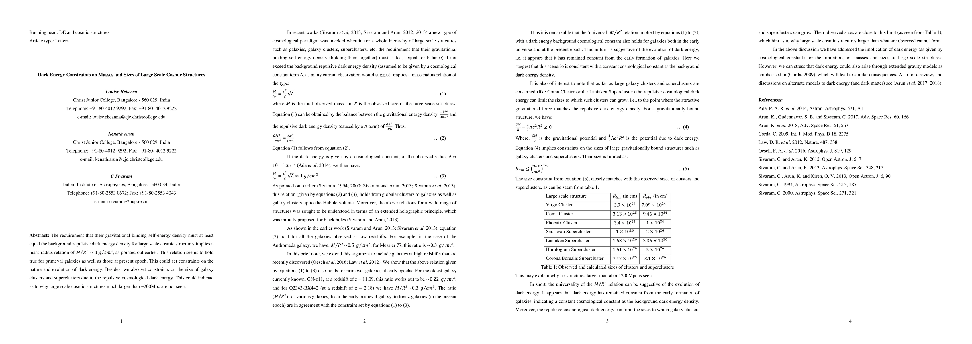 This paper explores the mass-radius relation for large scale cosmic structures, finding that their gravitational binding energy must balance the background dark energy density, leading to a constraint of M/R^2 ~ 1g/cm^2. This relation may provide insights into the nature and evolution of dark energy and explains the absence of structures larger than ~200Mpc.