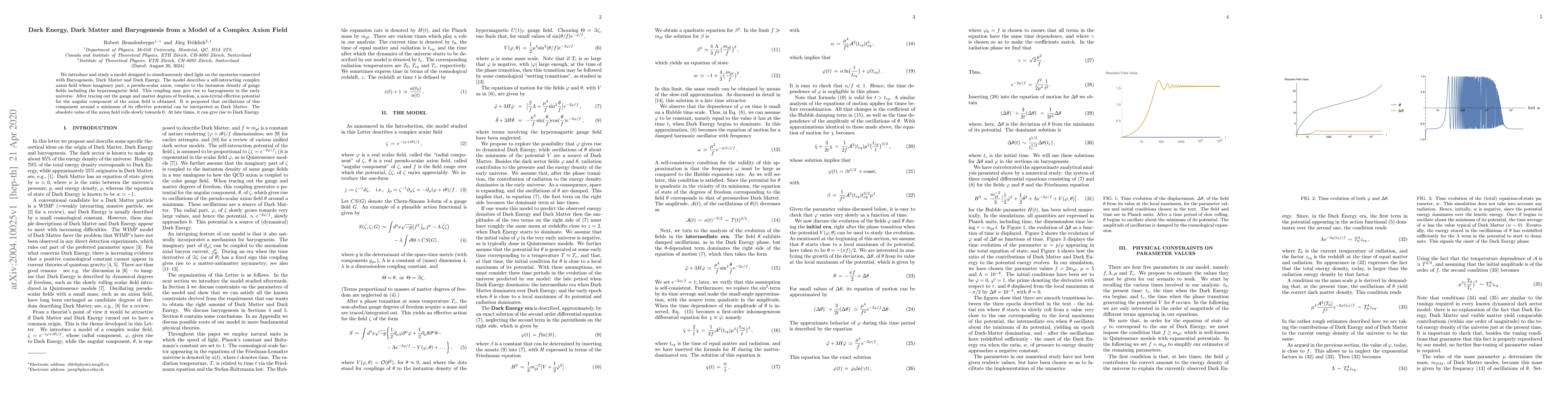 This paper proposes a model featuring a self-interacting complex axion field that explains Baryogenesis through its coupling to gauge fields, interprets oscillations of the axion's angular component as Dark Matter, and suggests the axion field's slow roll towards zero generates Dark Energy.