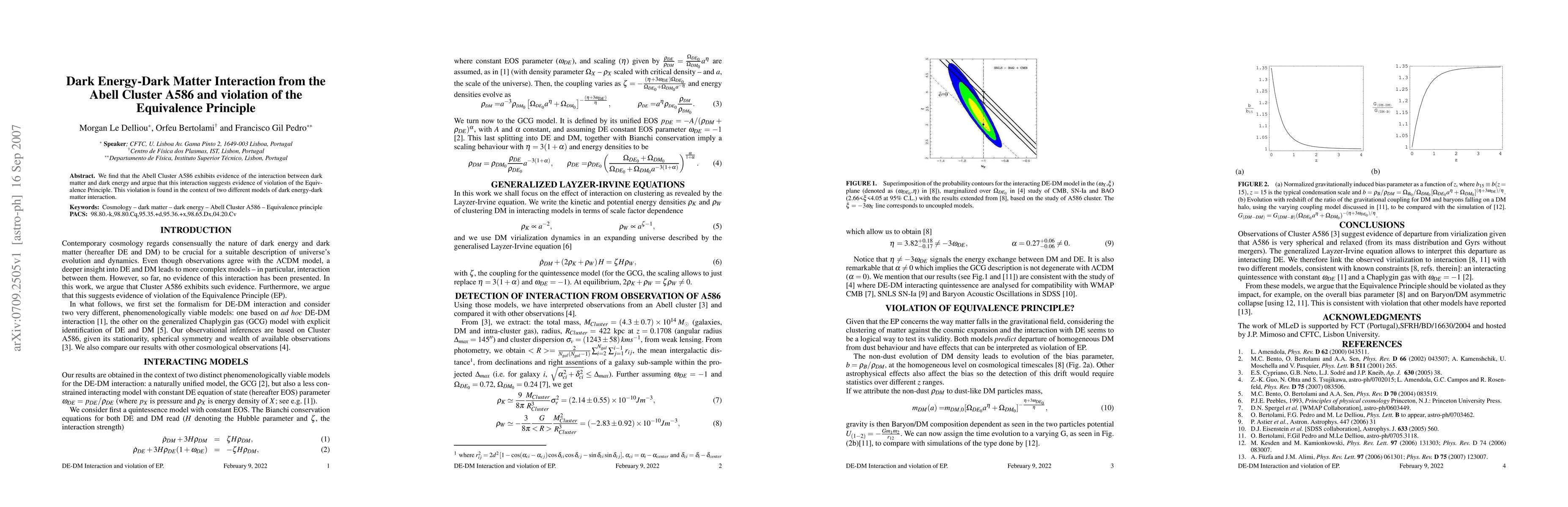 Summary: Research reveals interaction between dark matter and dark energy in the Abell Cluster A586, suggesting a violation of the Equivalence Principle, based on findings from two distinct interaction models.