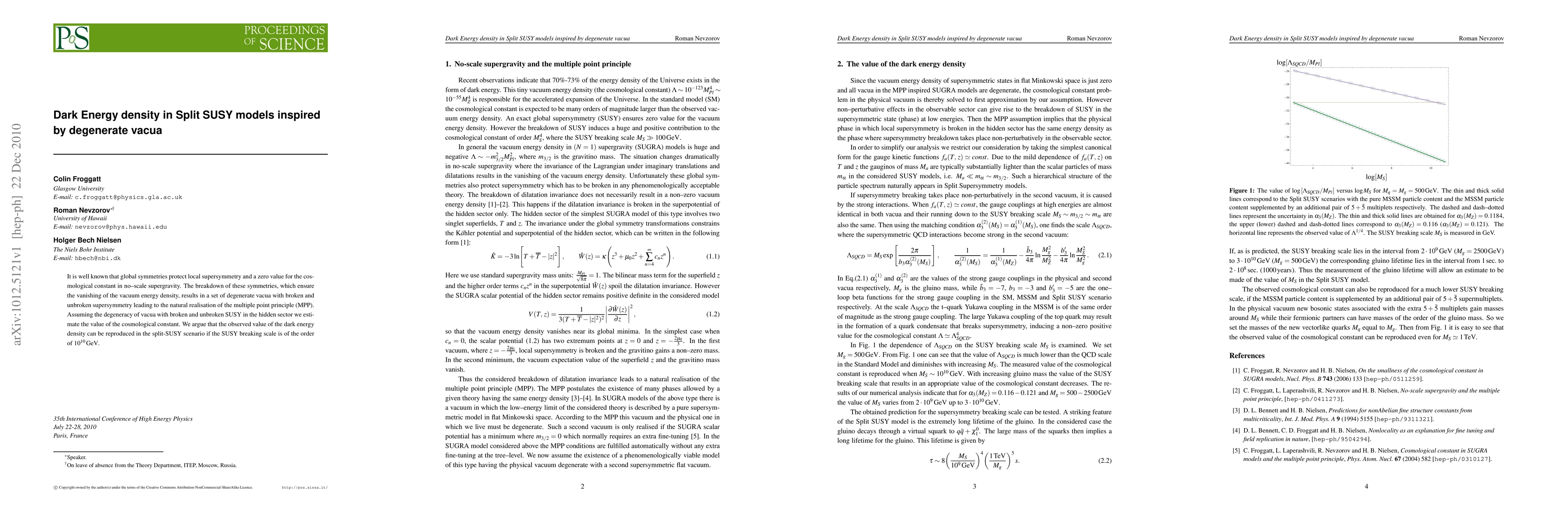 This paper explores the dark energy density in split SUSY models where degenerate vacua lead to broken and unbroken supersymmetry. It concludes that the observed dark energy density can be explained if the SUSY breaking scale is around 10^10 GeV.