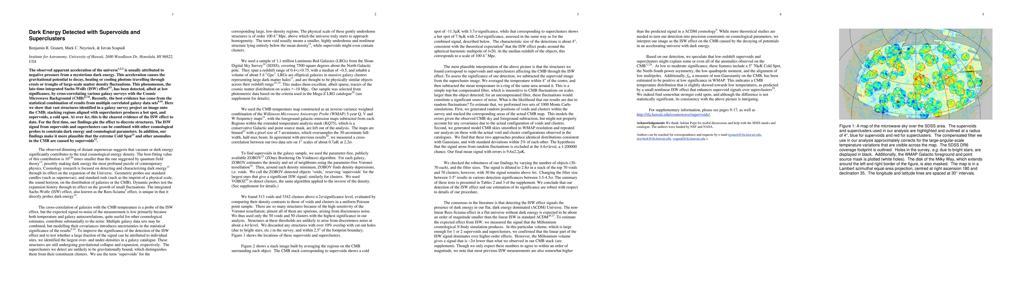 Researchers detect dark energy through a new method that uses galaxy surveys to identify superclusters and supervoids, which create hot and cold spots in the Cosmic Microwave Background (CMB). This is the clearest evidence of the late-time integrated Sachs-Wolfe effect to date, pinning down dark energy parameters.