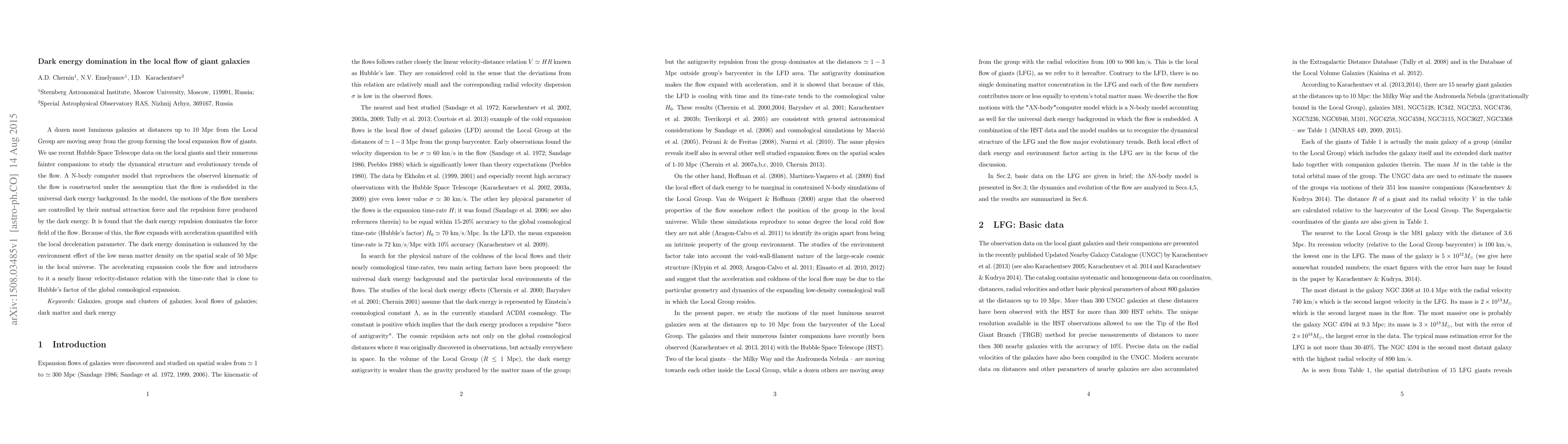 A dozen most luminous galaxies at distances up to 10 Mpc from the Local Group are moving away from the group forming the local expansion flow of giants. We use recent Hubble Space Telescope data on the local giants and their numerous fainter companions to study the dynamical structure and evolutionary trends of the flow. It is demonstrated that the dynamics of the flow is dominated by local dark energy. Keywords: Galaxies, groups and clusters of galaxies; local flows of galaxies; dark energy.